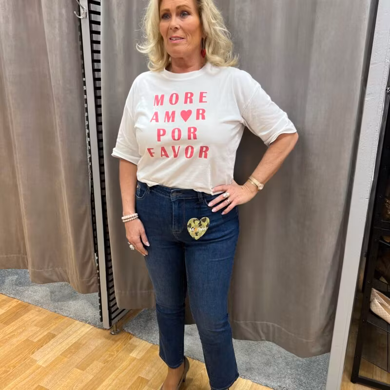 Ett par mörkblå jeans som är rymliga i passformen, så vi rekommenderar att man går ner en storlek. Modellen är 172 cm och bär storlek 42. Material: 69% bomull, 27,1%, 1,9% viskos, 2% elastan