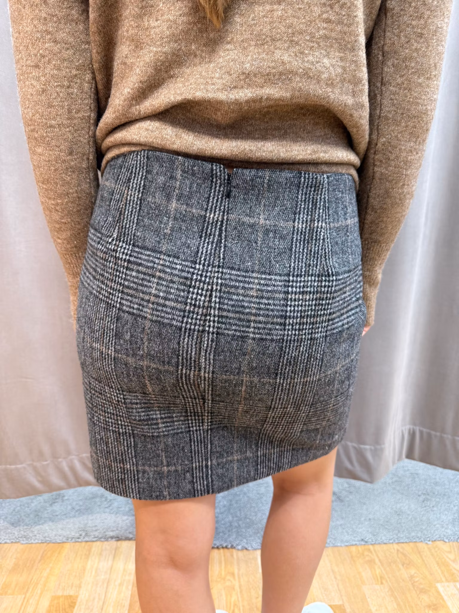 Ge din garderob en tidlös uppdatering med denna grå rutiga kjol i ullmix. Kjolen har en klassisk prince of wales-rutig design i mörkgrå toner med subtila bruna inslag, vilket gör den både stilren och mångsidig.