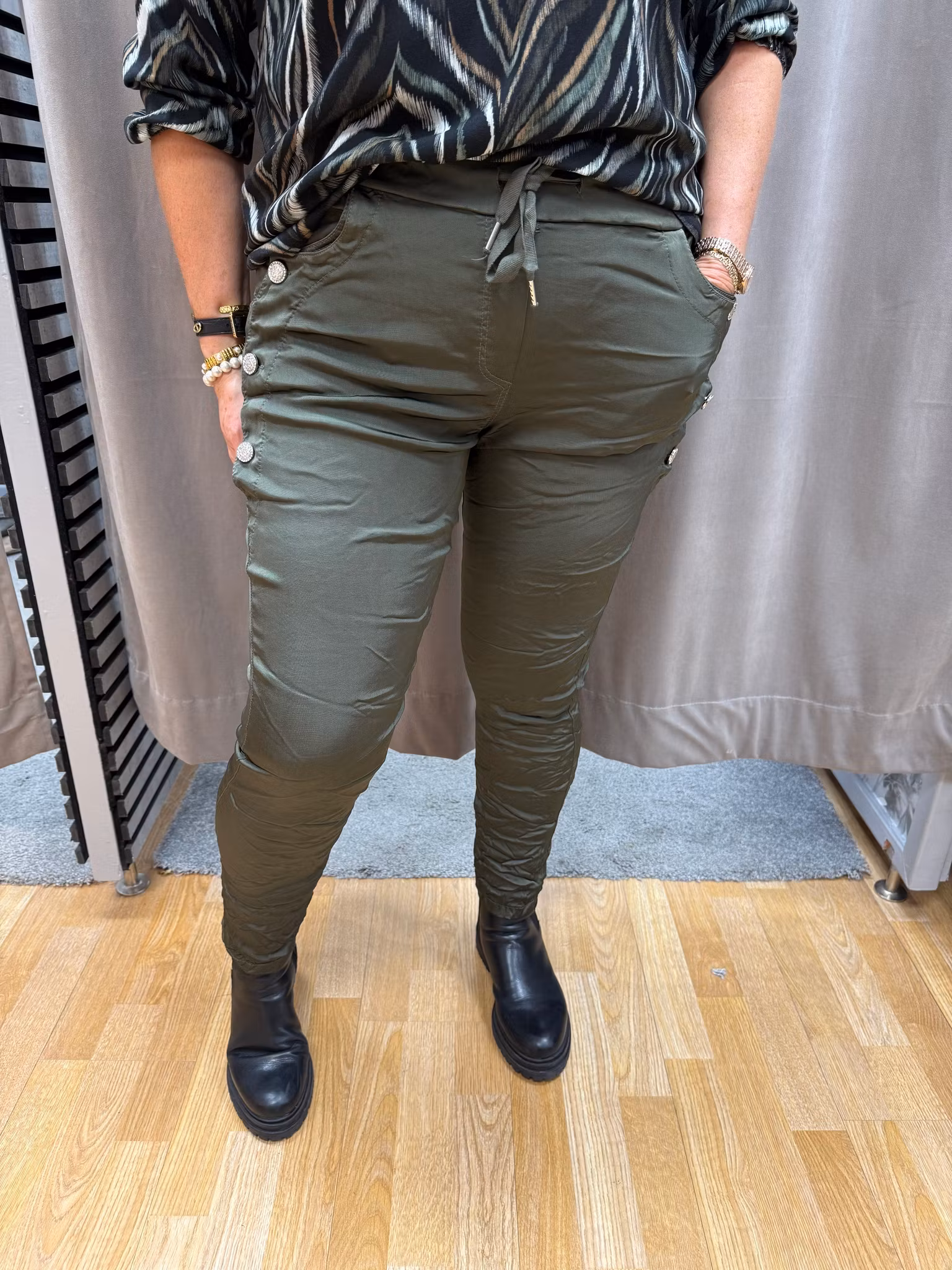 Dessa gröna magiska byxor i one size kombinerar stil och komfort i ett och samma plagg. Byxorna har en smickrande passform med lätt glansigt tyg och dekorativa silverfärgade knappar vid fickorna som ger en exklusiv och kvinnlig touch.