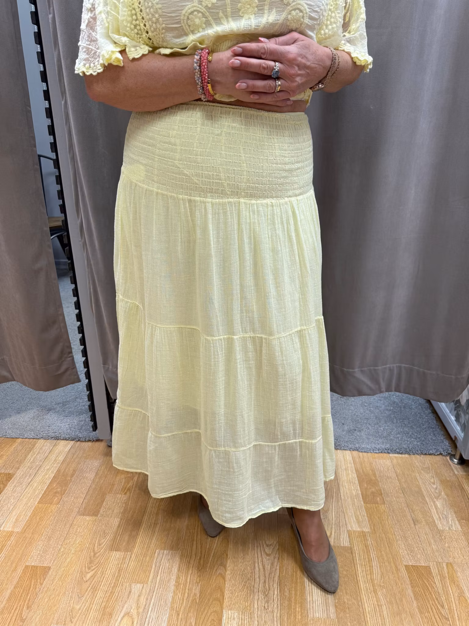 Somrig och feminin kjol i en mjuk, luftig kvalitet som ger ett lätt och elegant fall. Den ljusgula nyansen ger ett fräscht och soligt uttryck – perfekt för varmare dagar.