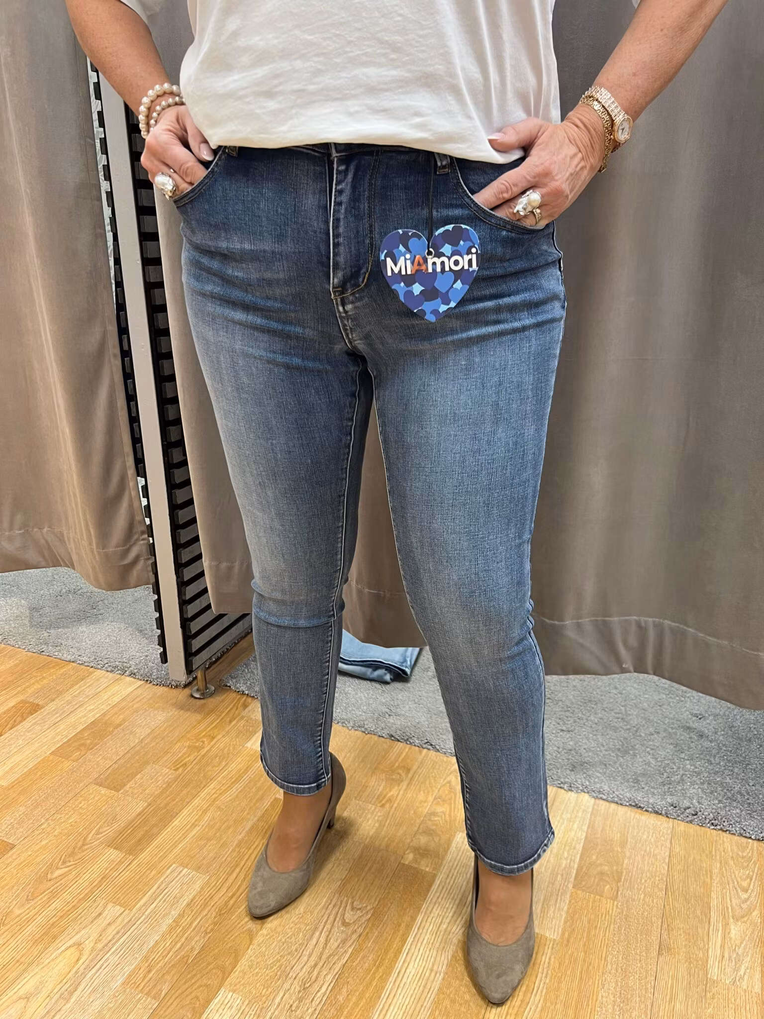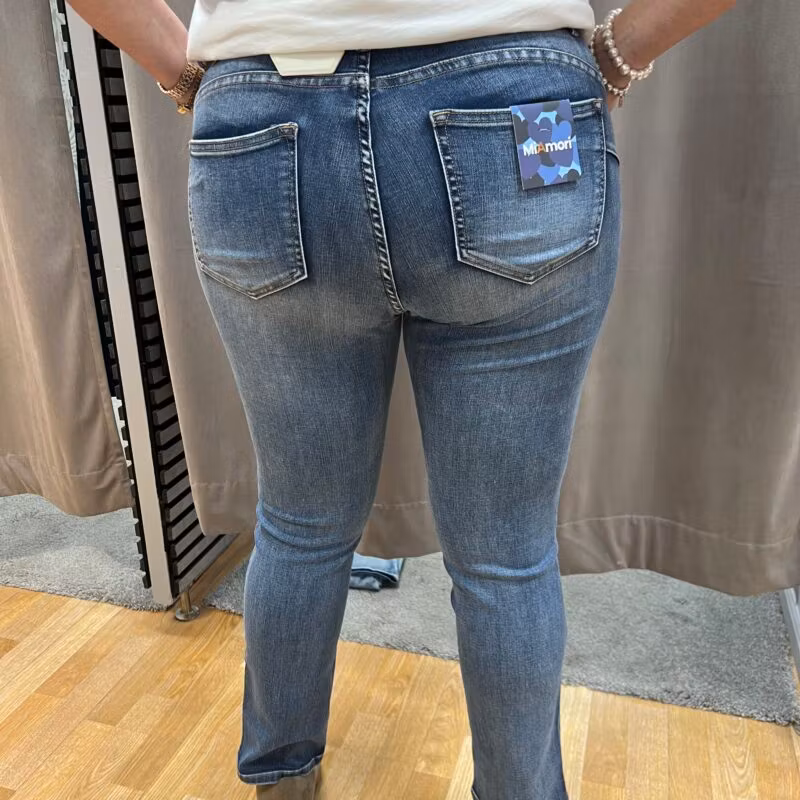 Ett par blå jeans som är rymliga i storleken, vi rekommenderar att du tar en storlek mindre. Innerbenslängden är 75 cm.