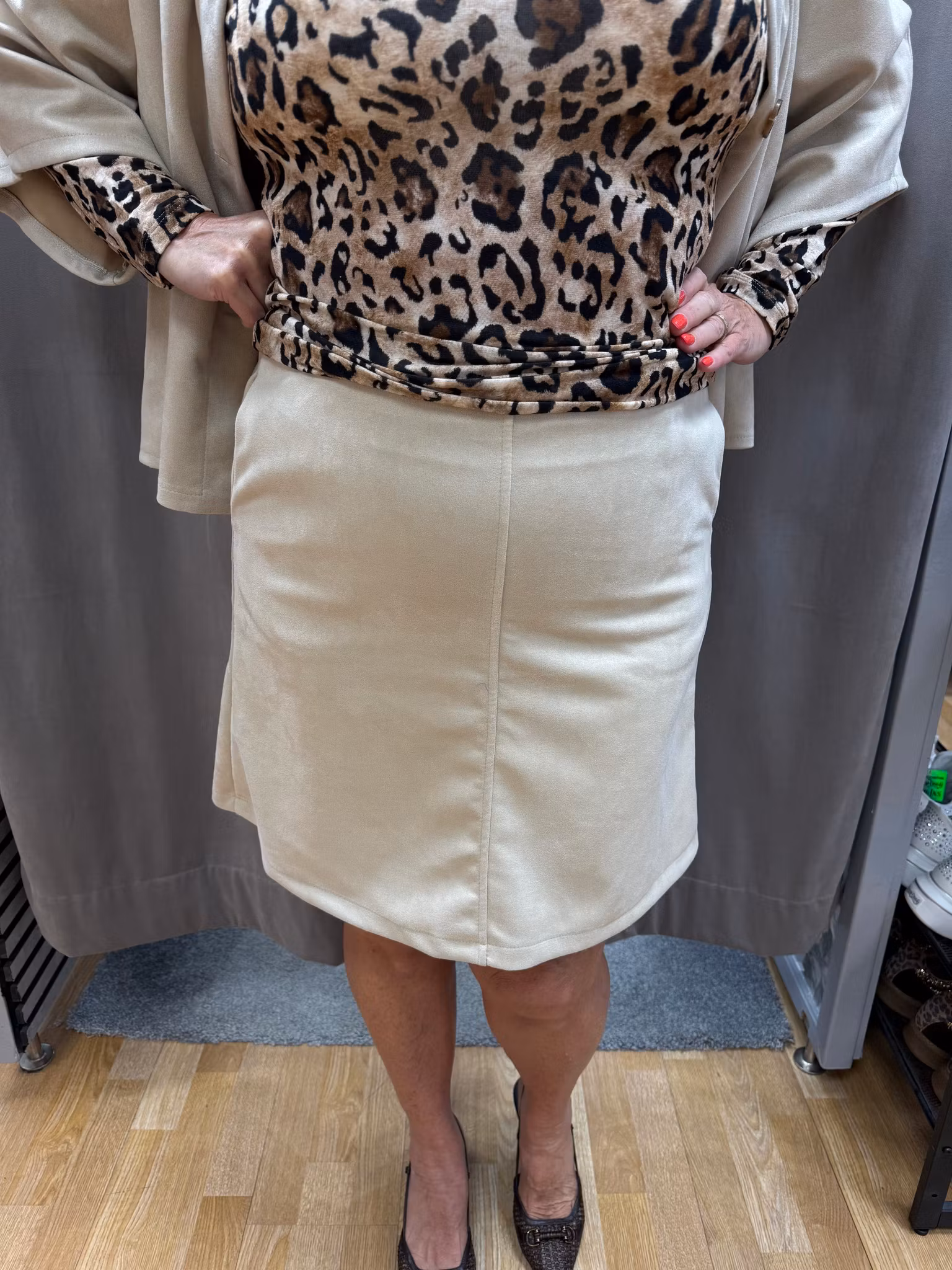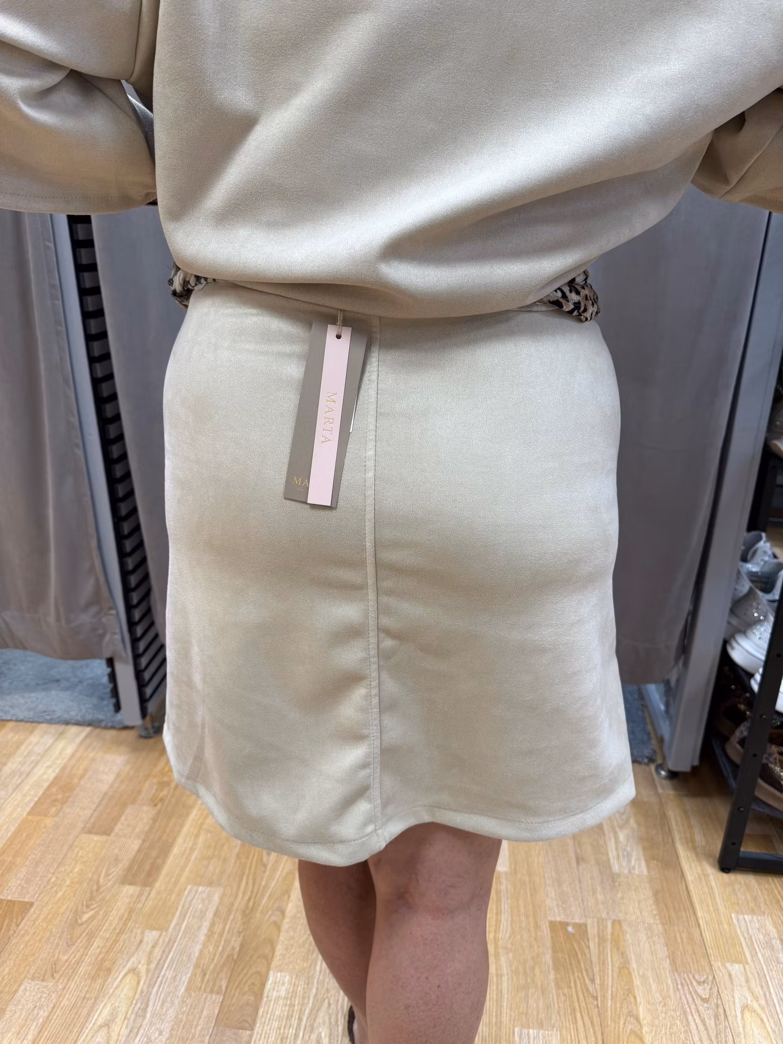 Stilren och feminin beige kjol i mjuk mockaimitation som ger en exklusiv känsla och en elegant silhuett. Kjolen har en rak, lätt figurnära passform som är smickrande och bekväm att bära. Det mockaliknande materialet är mjukt, följsamt och passar perfekt både till vardag och mer uppklädda tillfällen.