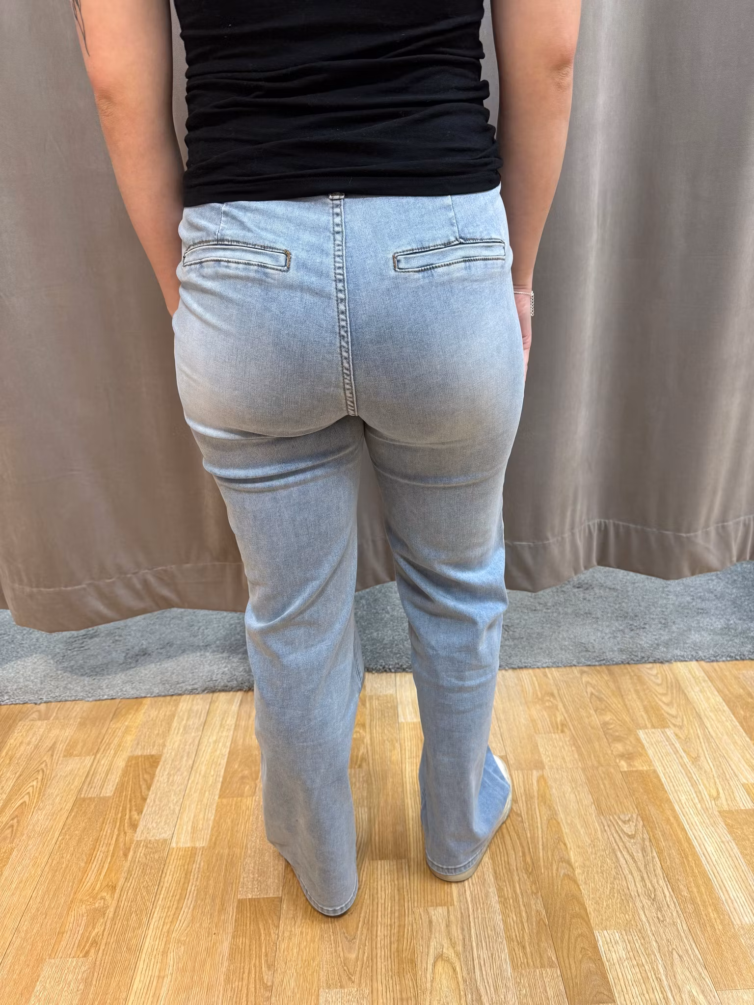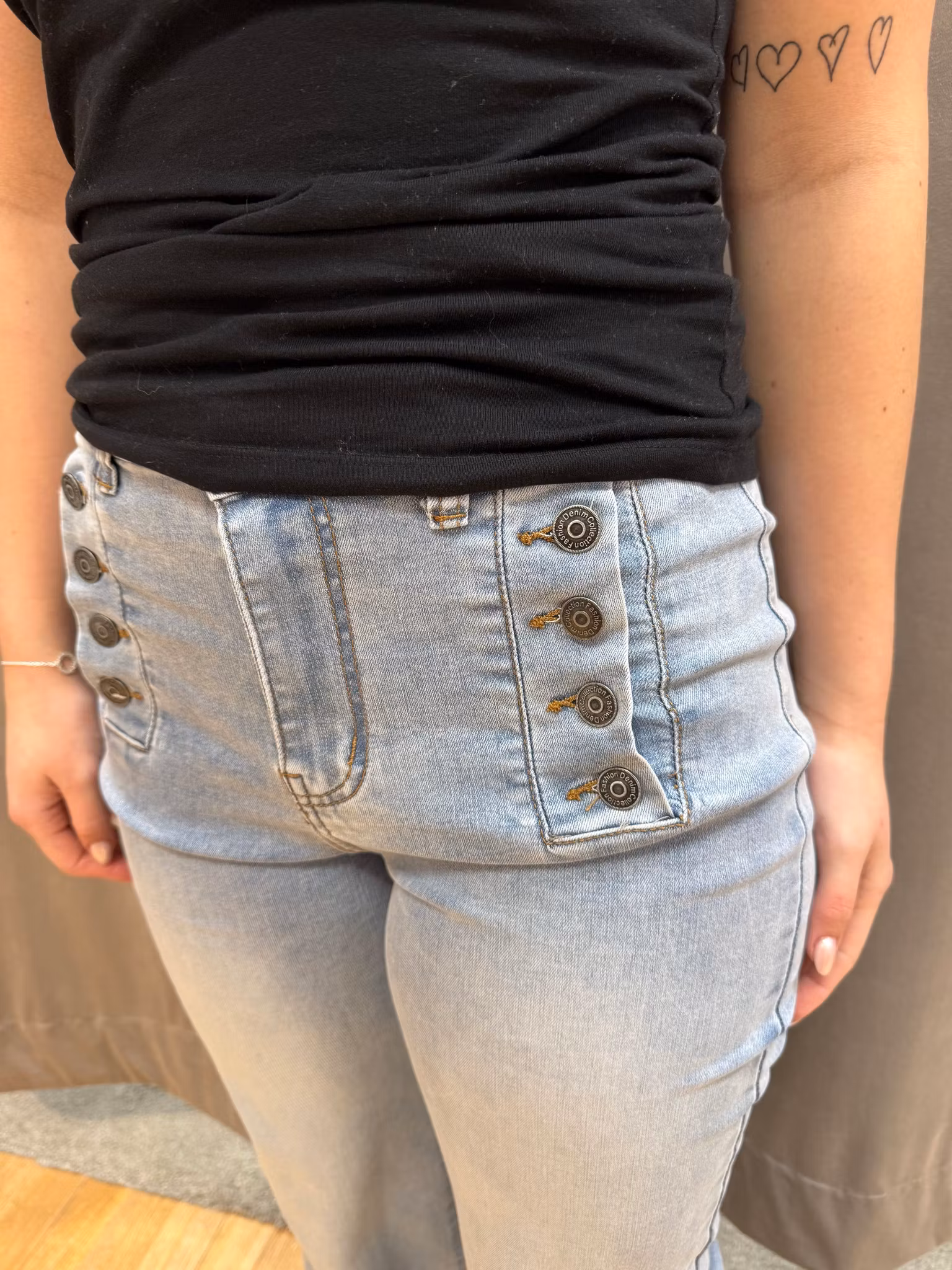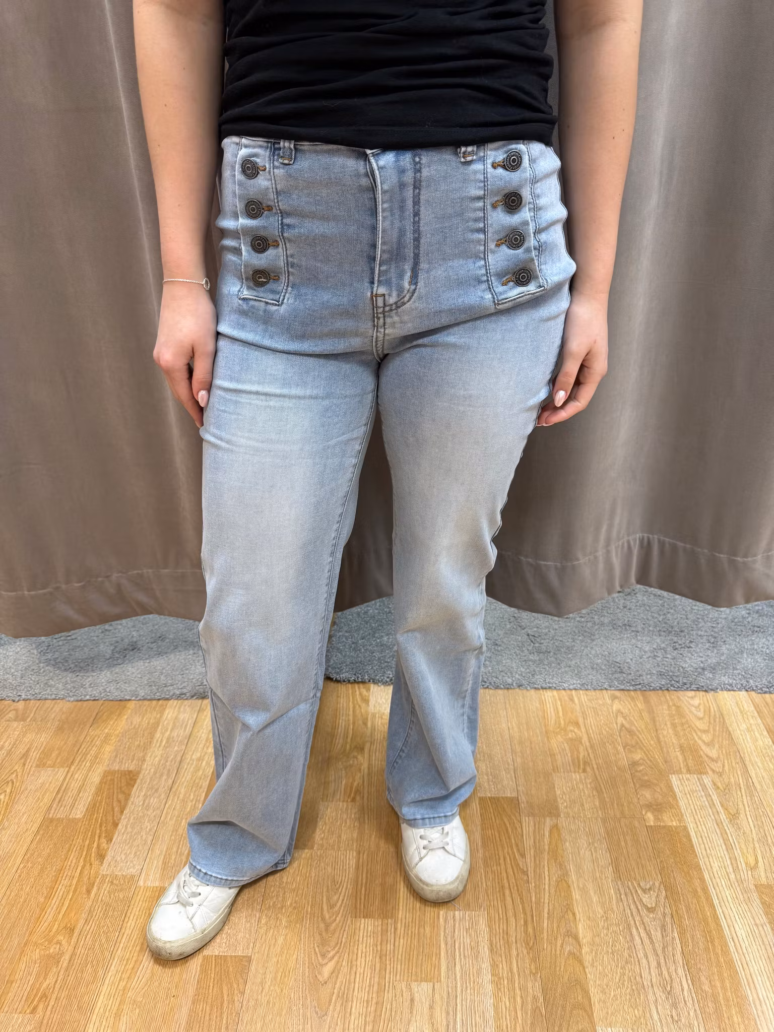 Ett par välsittande jeans med hög midja som ger en smickrande och bekväm passform. Modellen har dekorativa knappar framtill som skapar en snygg detalj och ger jeansen ett stilrent uttryck. Rak till lätt utsvängd benform ger en modern silhuett och gör dem enkla att kombinera med både toppar, blusar och stickat. Jeansen har fickor bak och är sköna att bära hela dagen tack vare ett följsamt material med stretch. Perfekta för både vardag och mer uppklädda tillfällen.
