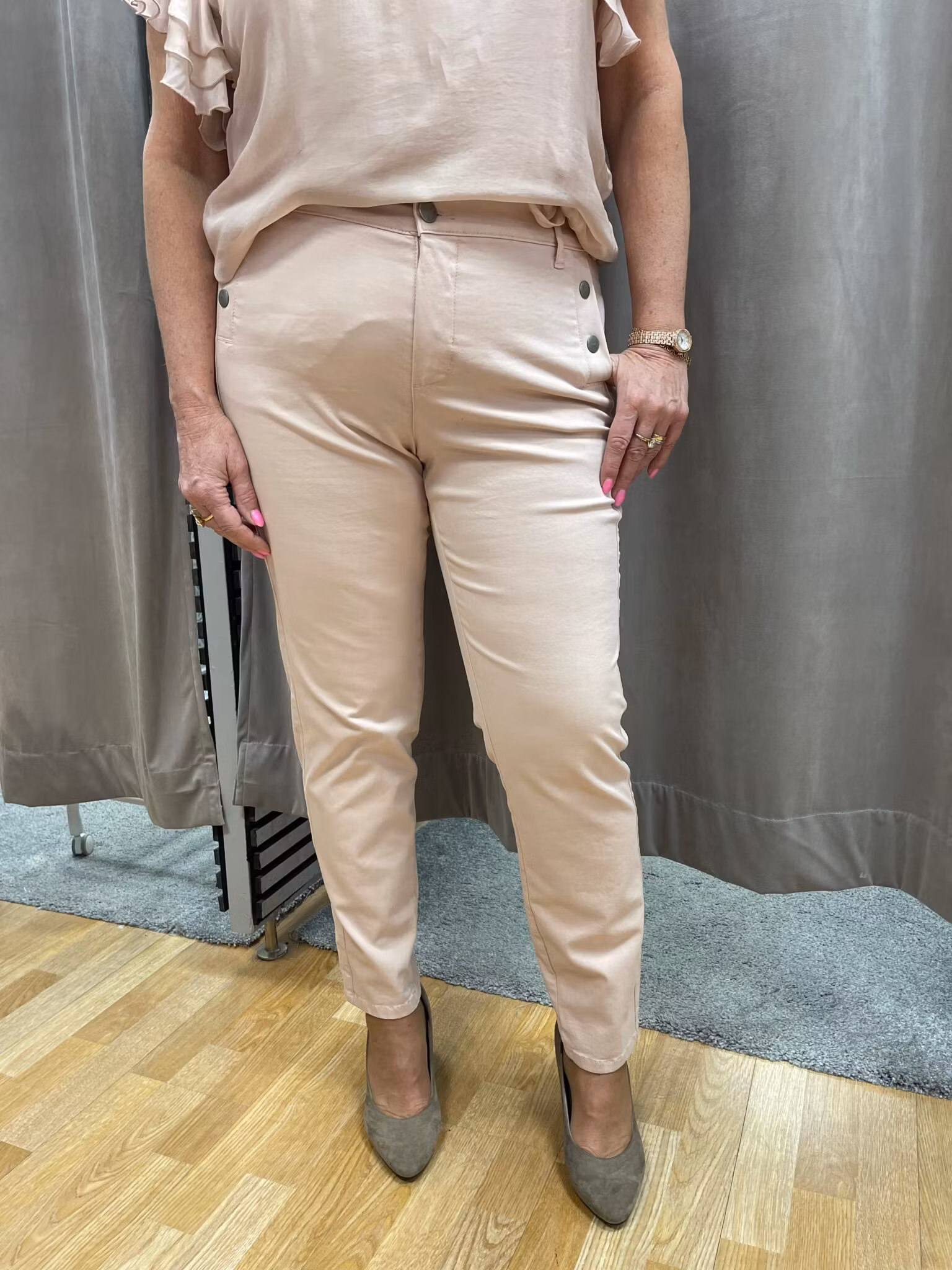 Ett par ankellånga ljusrosa byxor i normal passform med hög midja. Dekorativa knappar vid fickorna. Modellen är 172 cm och bär storlek 44. Material: 65% bomull, 30% polyester, 5% elastan