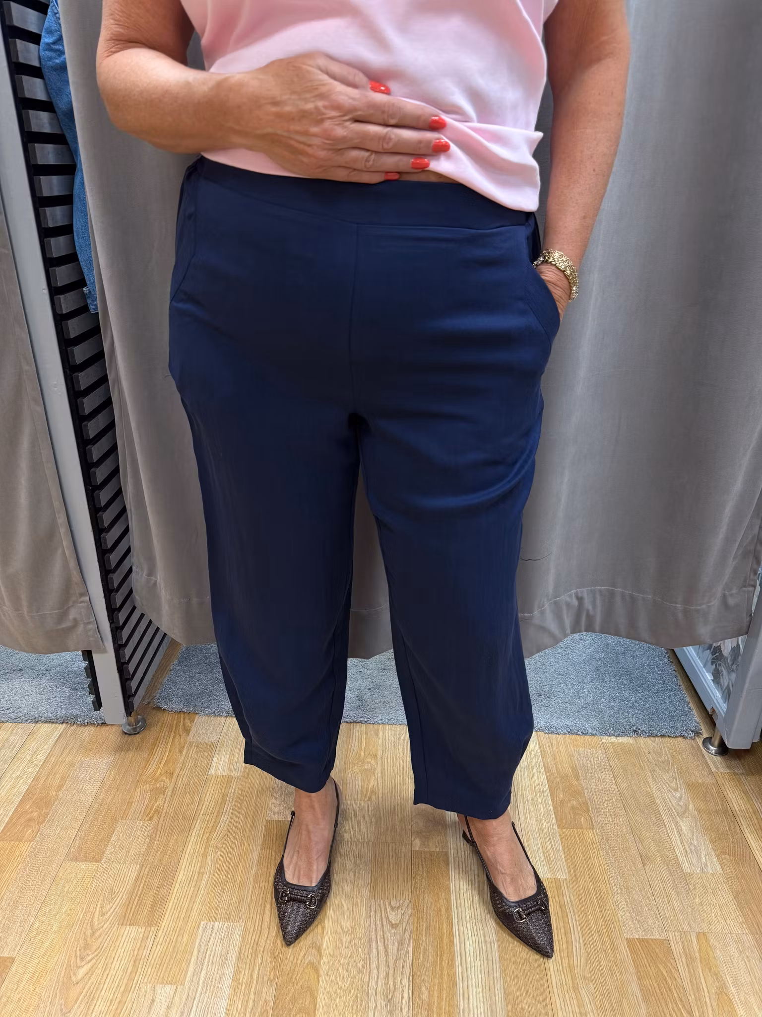 Eleganta och bekväma marinblå byxor i mjukt Tencel-material som ger ett lyxigt, följsamt fall och hög komfort. Tencel är ett andningsbart och hudvänligt material som känns svalt mot huden och gör byxorna perfekta att bära hela dagen.