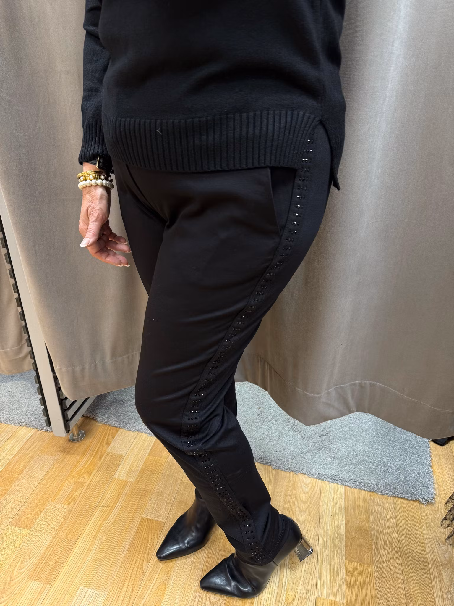 Svarta byxor med dekorativa stenar längs sidorna som ger en elegant och modern look. Byxorna har en mjuk resårmidja med dragsko för bekväm passform och lätt stretchigt material som formar sig snyggt efter kroppen. En perfekt kombination av stil och komfort – lika fina till vardags med sneakers som till fest med klackar.