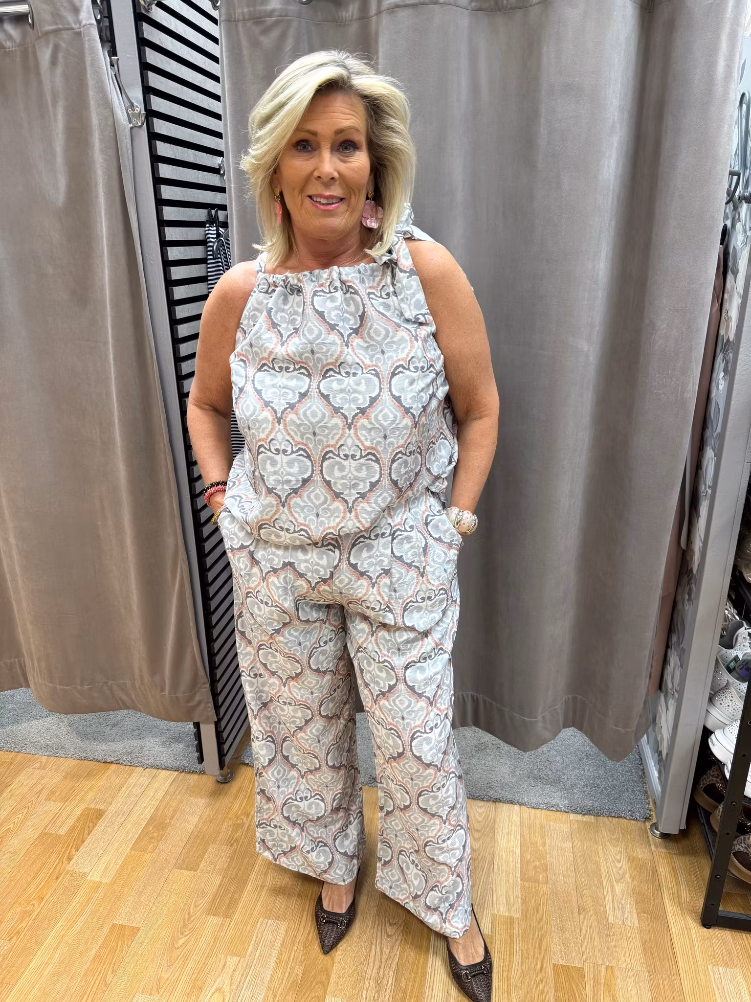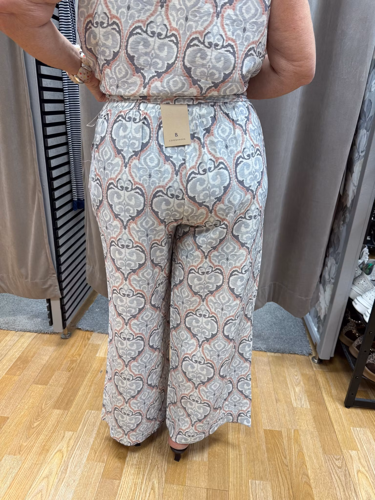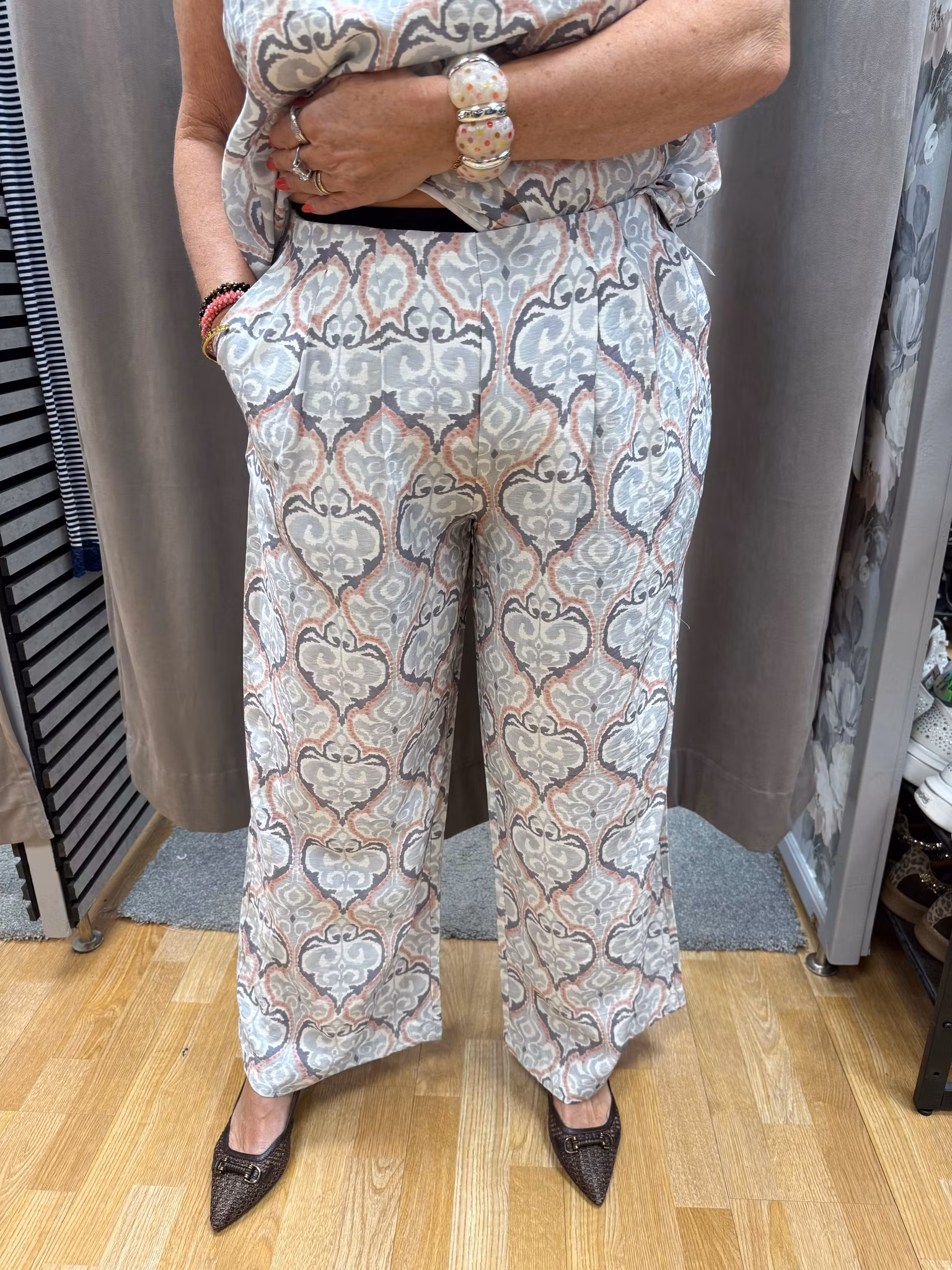 Eleganta och bekväma byxor med dekorativt mönster i mjuka toner av grått, beige och rosa. Den vida modellen ger ett snyggt fall och en luftig känsla som passar perfekt både till vardag och festligare tillfällen.