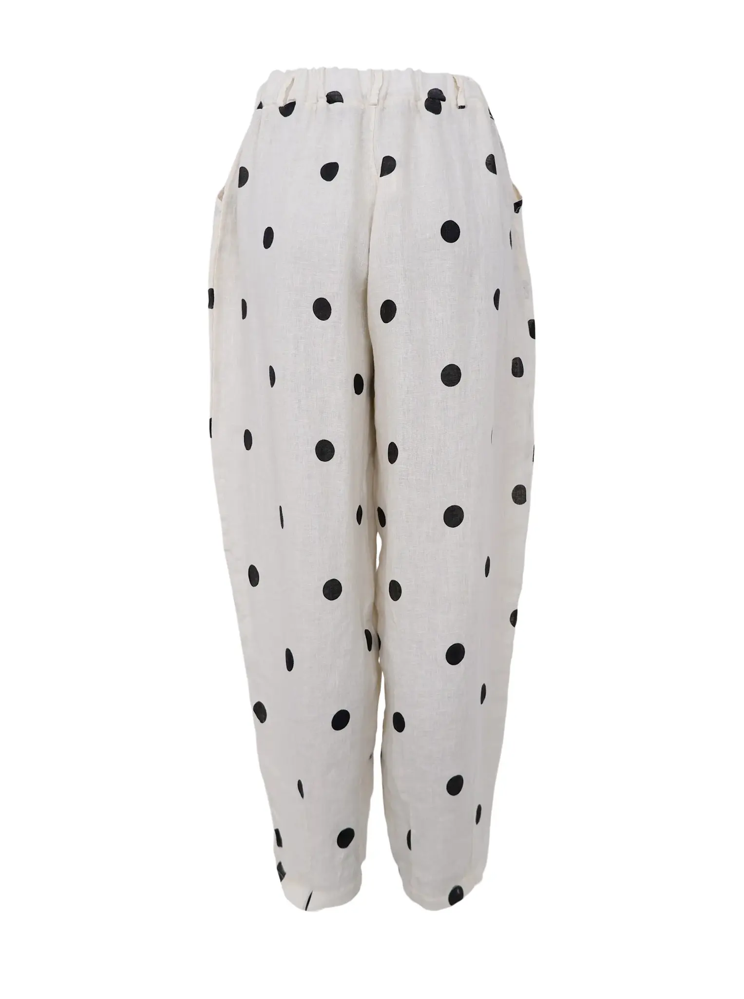 Stilrena barrel-formade linnebyxor med elastisk midja, sidfickor och bälteshällor.