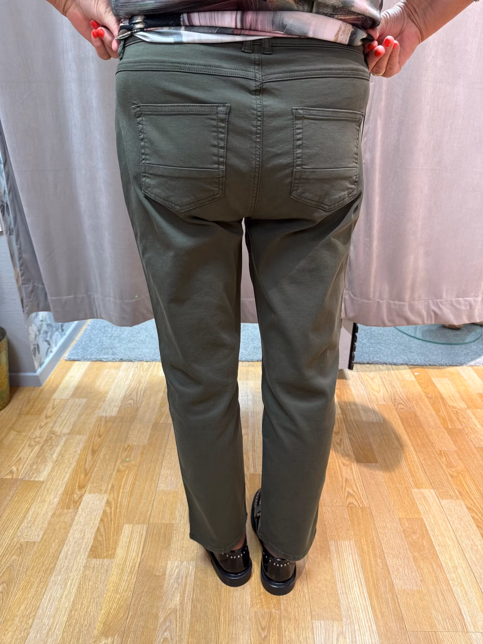 Bekväma och stilrena byxor i mjuk bomullsblandning med stretch för perfekt passform. Byxorna har en modern, rak modell med dekorativa sömmar framtill och praktiska fickor både fram och bak. Den olivgröna färgen gör dem lätta att kombinera med både neutrala och färgstarka överdelar. Passar lika bra till vardags som till en mer uppklädd look.