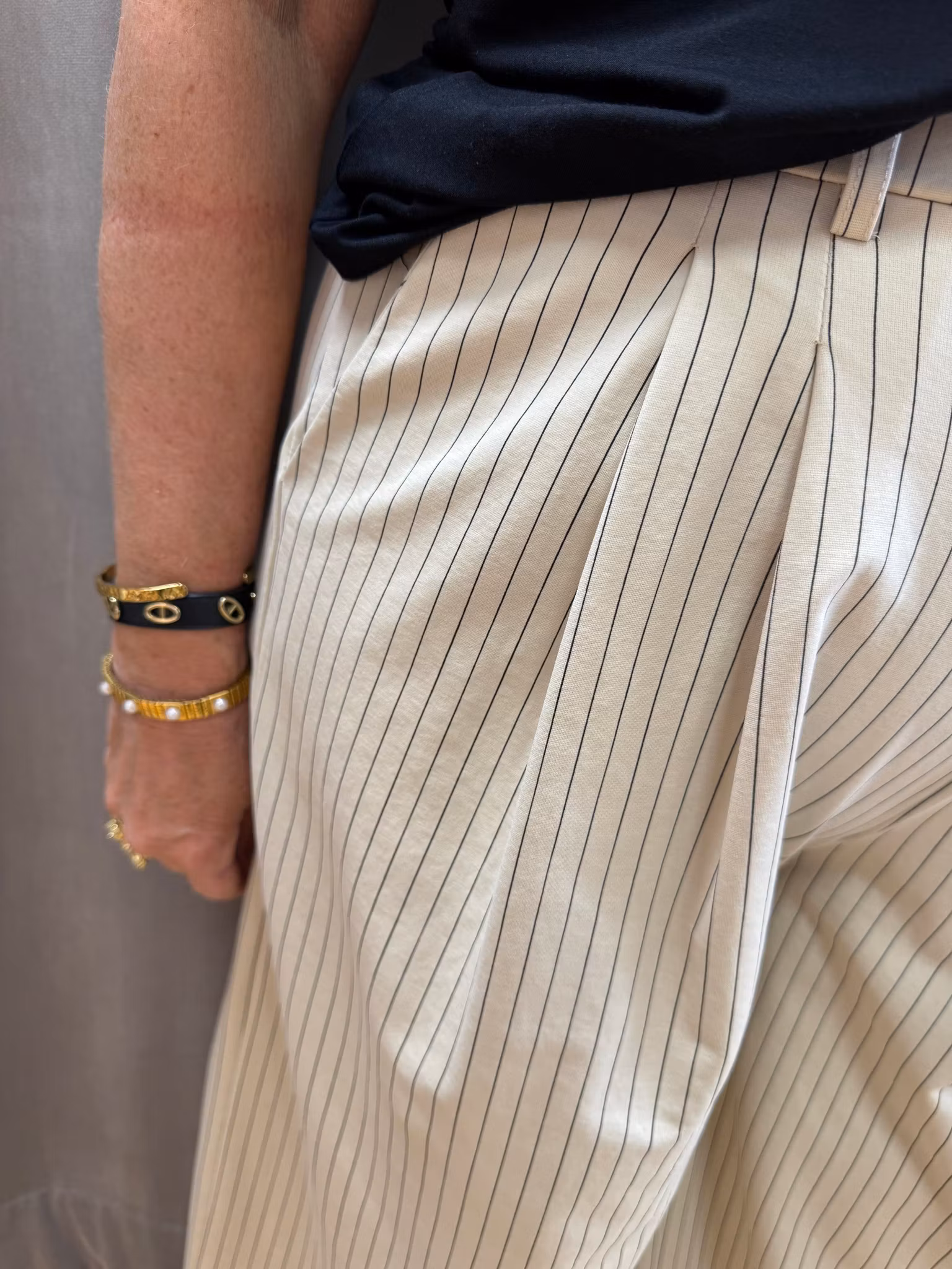 diskreta vertikala ränder som ger ett förlängande och smickrande intryck. Modellen har hög midja med snygga veck framtill som skapar en fin siluett och extra komfort. Den vida passformen ger ett luftigt och modernt uttryck – perfekt för både vardag och mer uppklädda tillfällen.