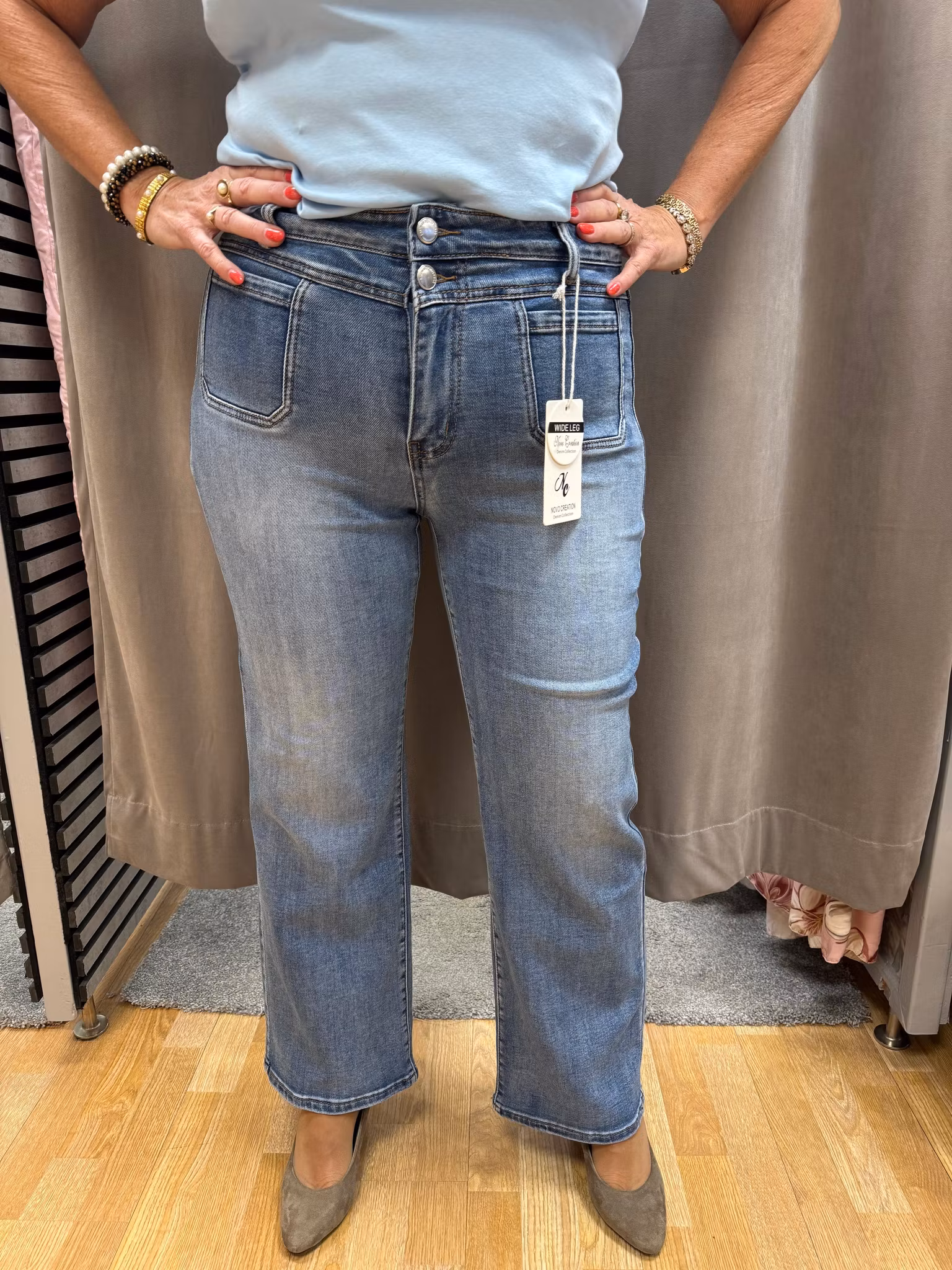 Den höga midjan med dubbel knäppning framtill ger extra stöd och en feminin form. Jeansen är tillverkade i mjuk och följsam denim med lätt stretch för optimal komfort hela dagen.