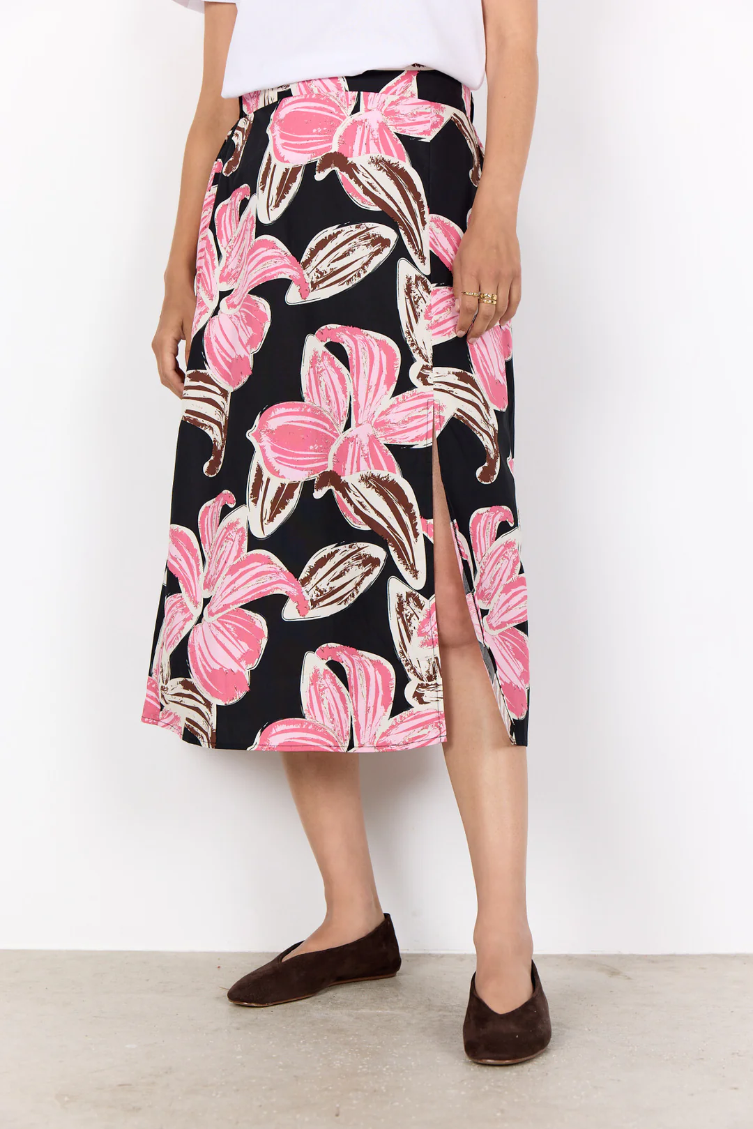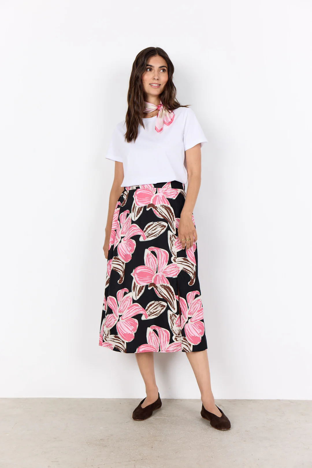 Kjol i 100% ekologisk bomull. Den här eleganta kjolen har ett iögonfallande blommönster, en smickrande knälängd och bekväm midjeresår. Kombinera den med en enfärgad topp och sandaler med remmar för en fantastisk look.