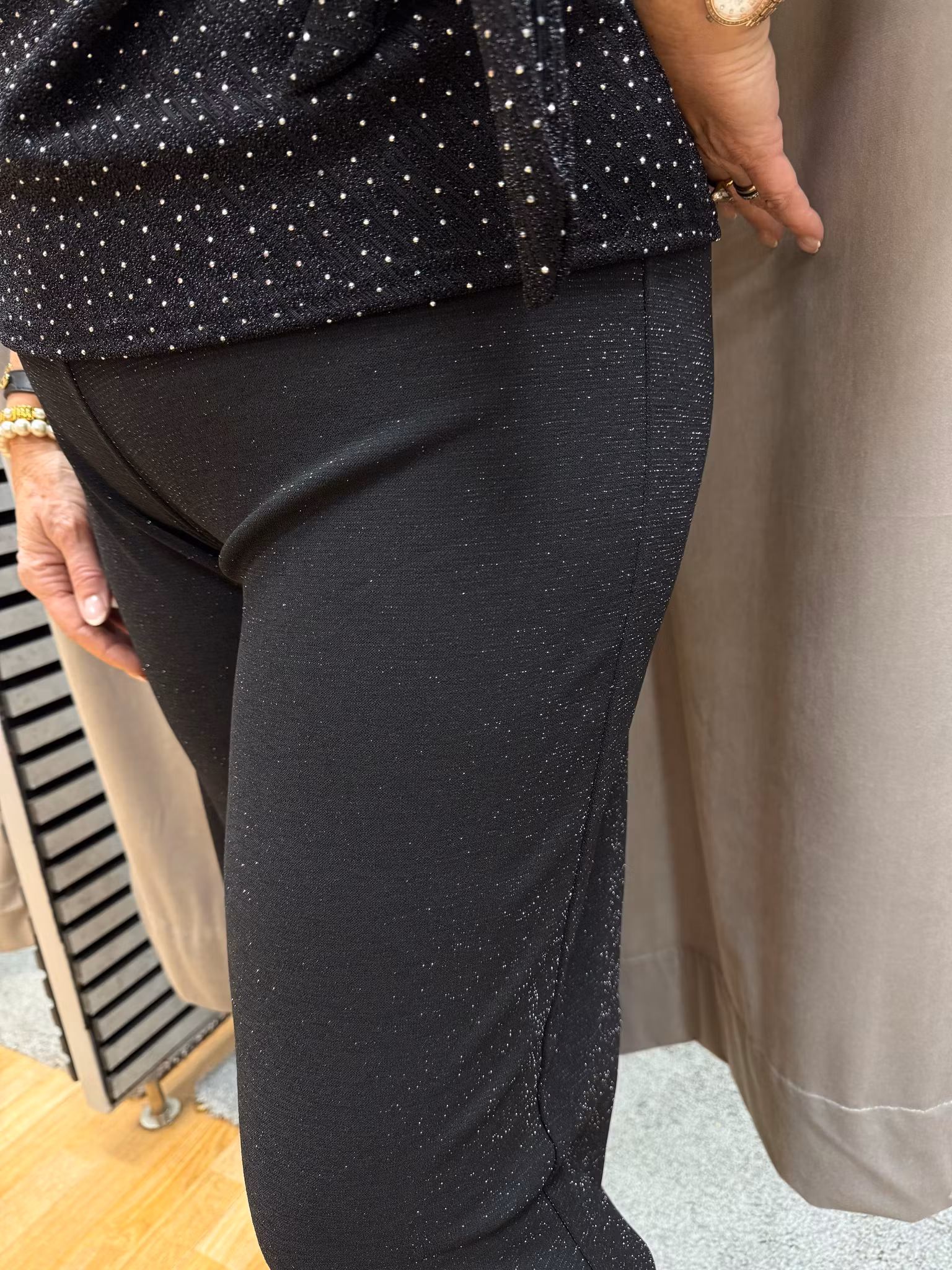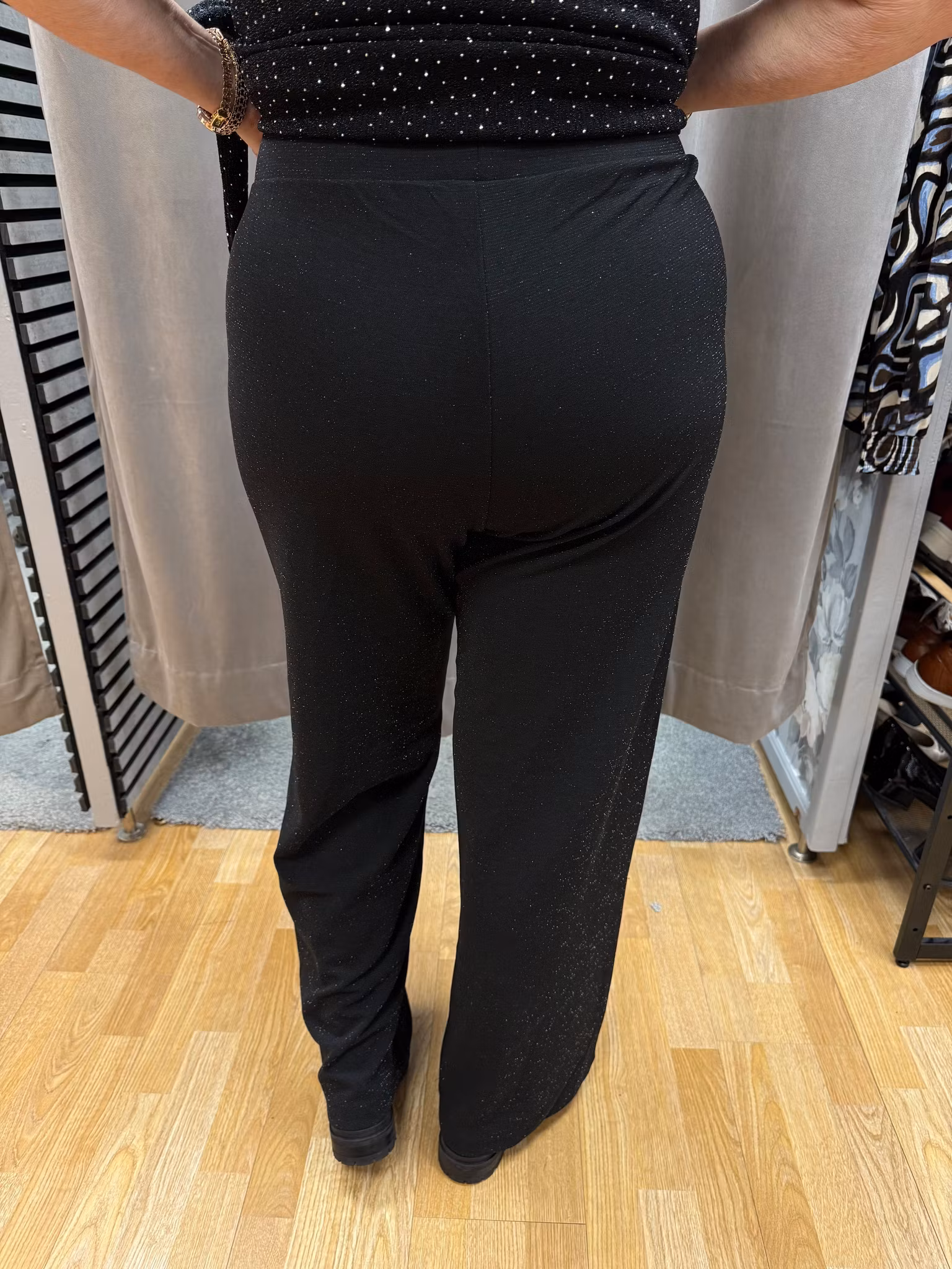 Stilrena svarta byxor med diskret glittereffekt som ger en elegant och festlig känsla. Byxorna har vid passform och resår i midjan för extra komfort och en smickrande siluett. Tillverkade i ett mjukt och stretchigt material som ger både rörelsefrihet och en klädd look. Perfekta att kombinera med en glittrig topp eller blus för en komplett festoutfit.