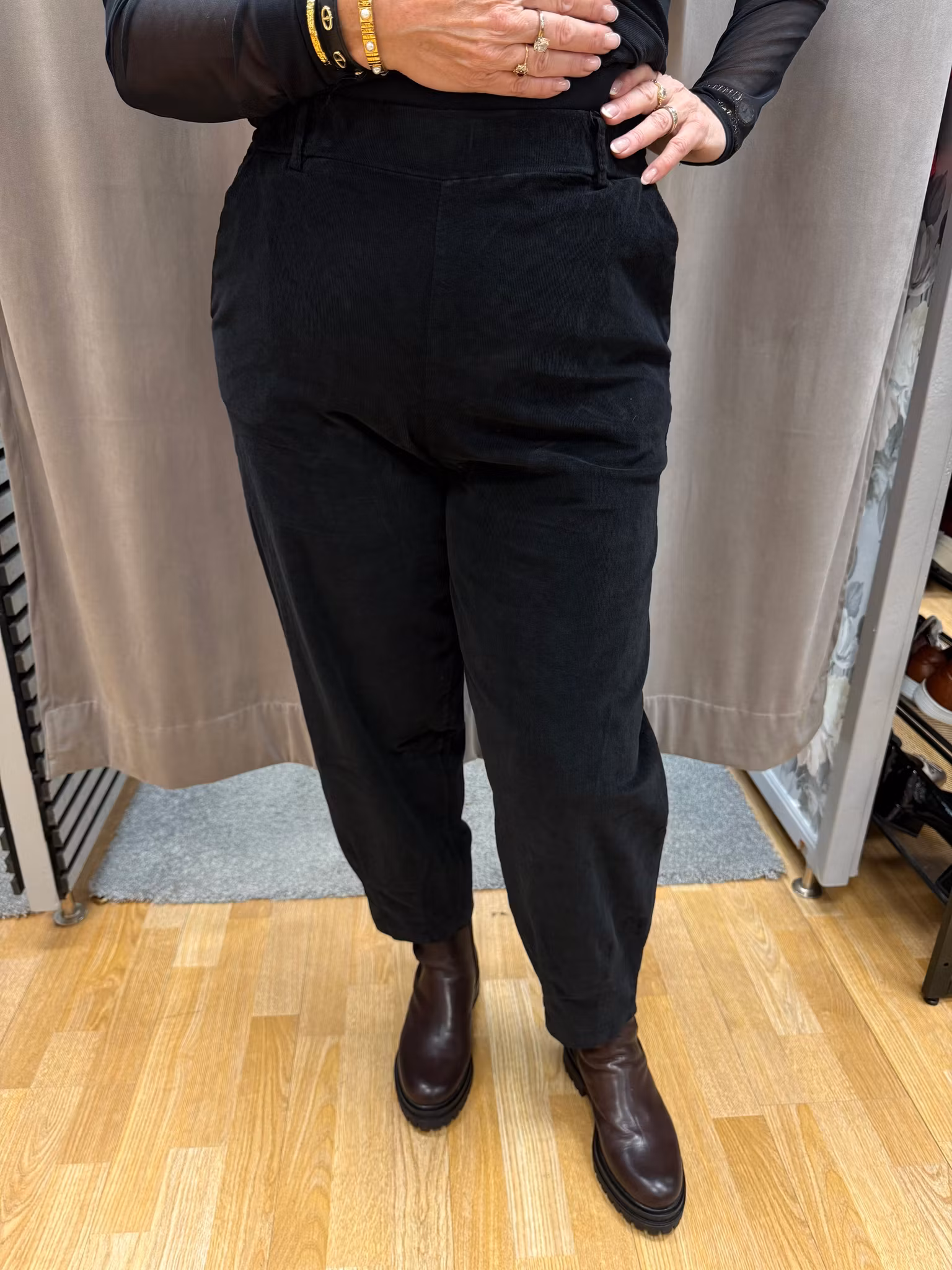 Bekväma och stilrena svarta byxor Barrel i mjukt, stretchigt material som ger perfekt passform och rörelsefrihet. Modellen har resår i midjan för extra komfort samt raka ben som skapar en tidlös och avslappnad siluett. Ett par mångsidiga byxor som passar lika bra till vardags som till kontoret – kombinera med en blus, stickad tröja eller kavaj för en komplett look.