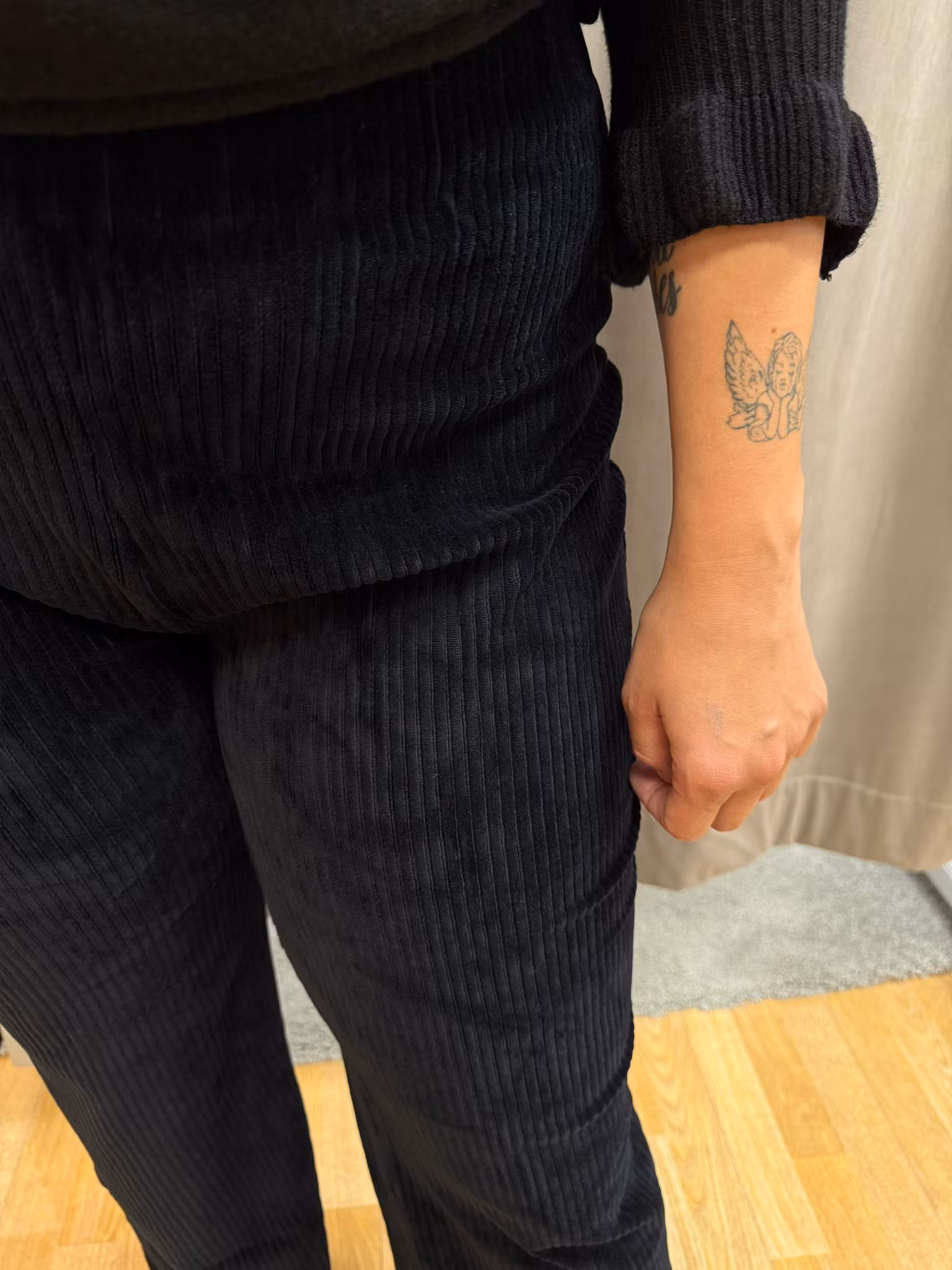 Stilrena svarta manchesterbyxor i mjuk bomull med hög midja och rak passform. Bekväma och tidlösa byxor som passar både till vardags och kontor. Perfekta att kombinera med stickad tröja eller blus för en klassisk look.