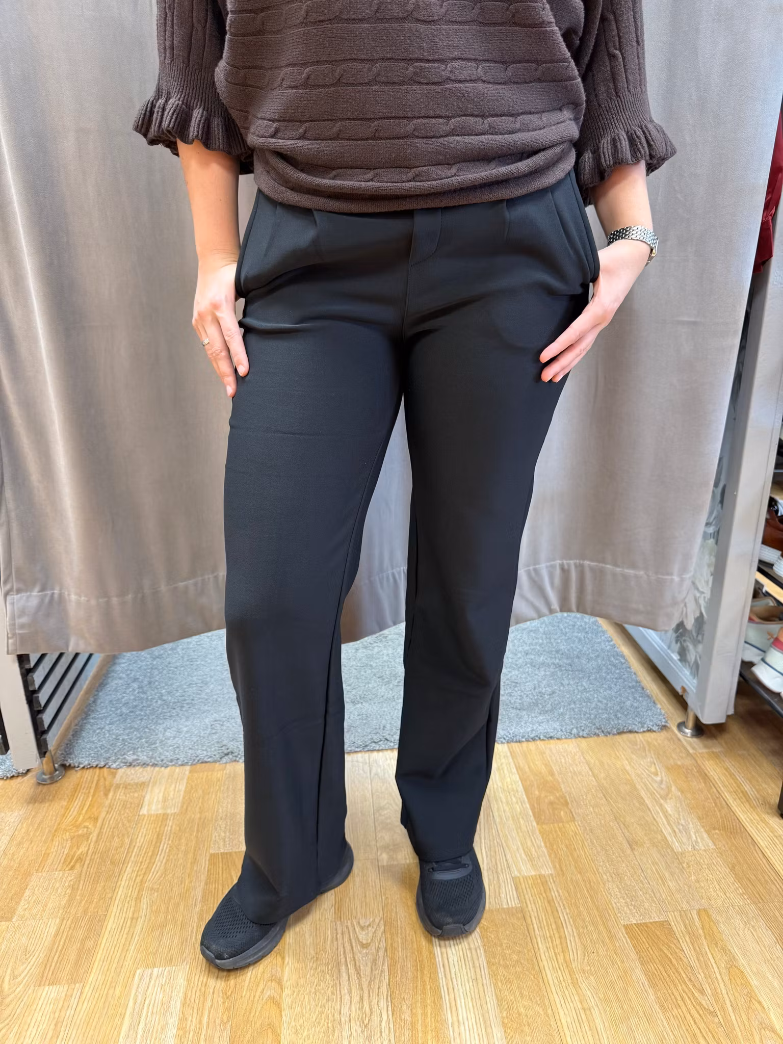 Bekväma och stilrena – dessa svarta byxor i superstretch är ett måste i garderoben. Modellen är designad utan dragkedja och med en smidig midja som gör dem enkla att ta på och bära hela dagen. Den raka passformen ger en elegant siluett, perfekt både till vardags och festligare tillfällen.