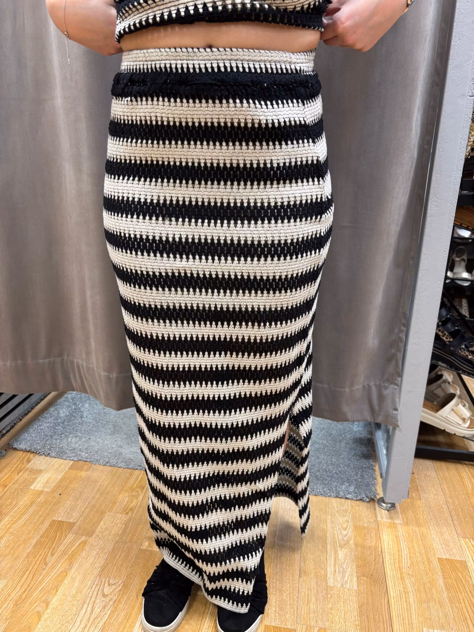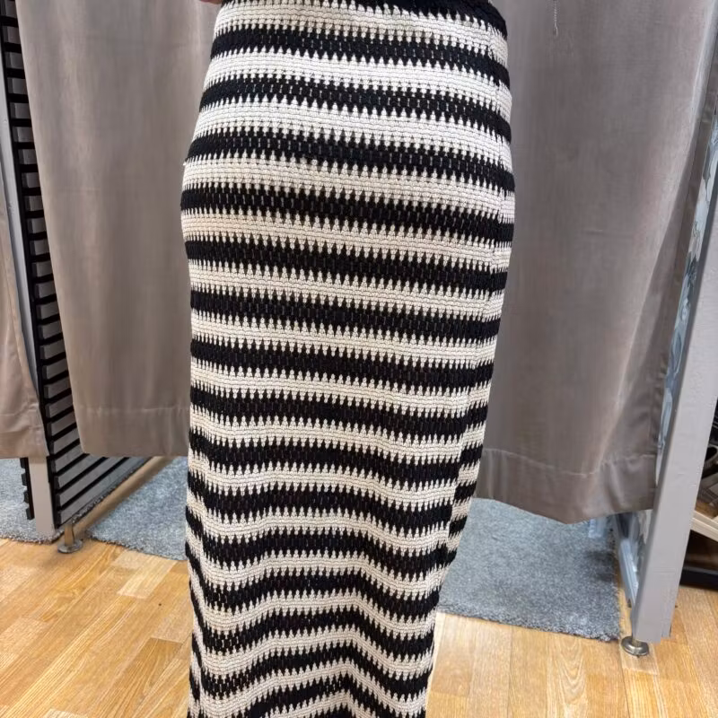 Svart/vit randig kjol 699 kr Storlek 36 38 40 42 44 46 I lager. Lägg i korgen Lagersaldo: Artikelnummer: 31 Leverantör: Kaffe Produktbeskrivning En svart/vit randig stickad maxikjol med slits. Tight passform.Modellen är 168 cm och bär storlek 34.Material: 100% bomull