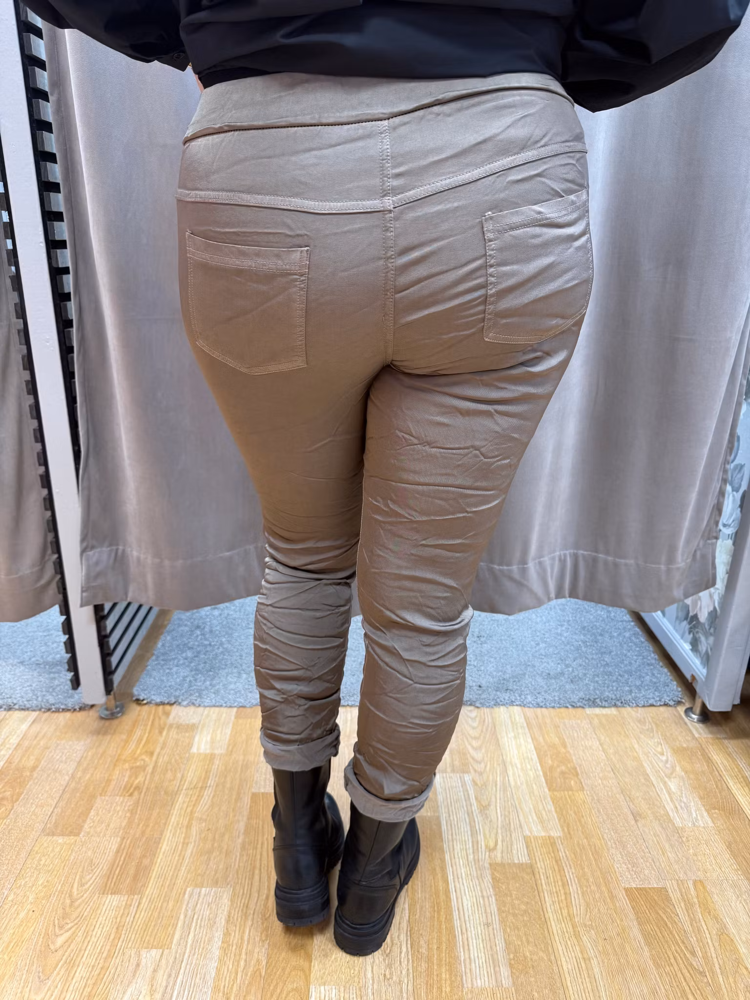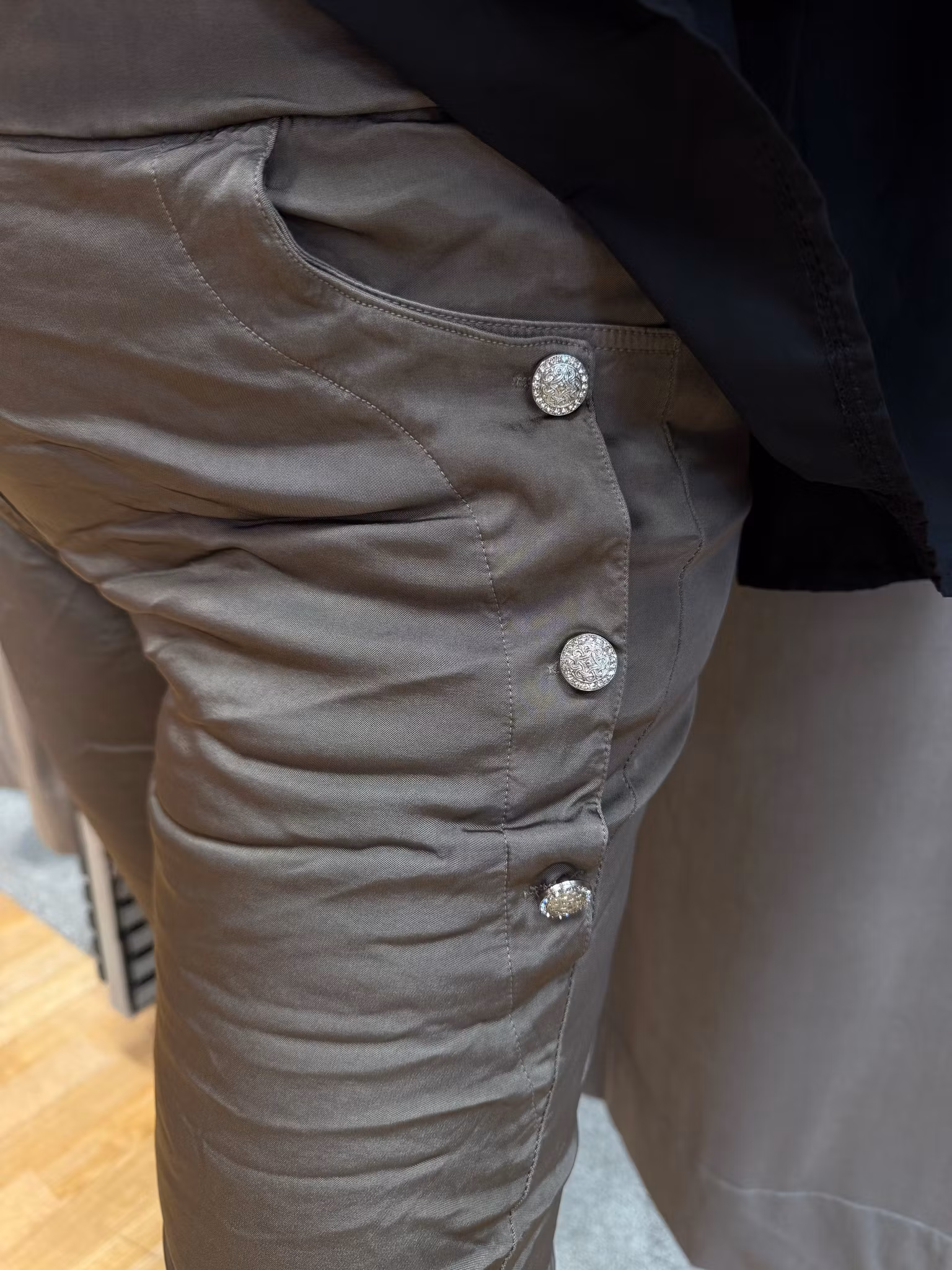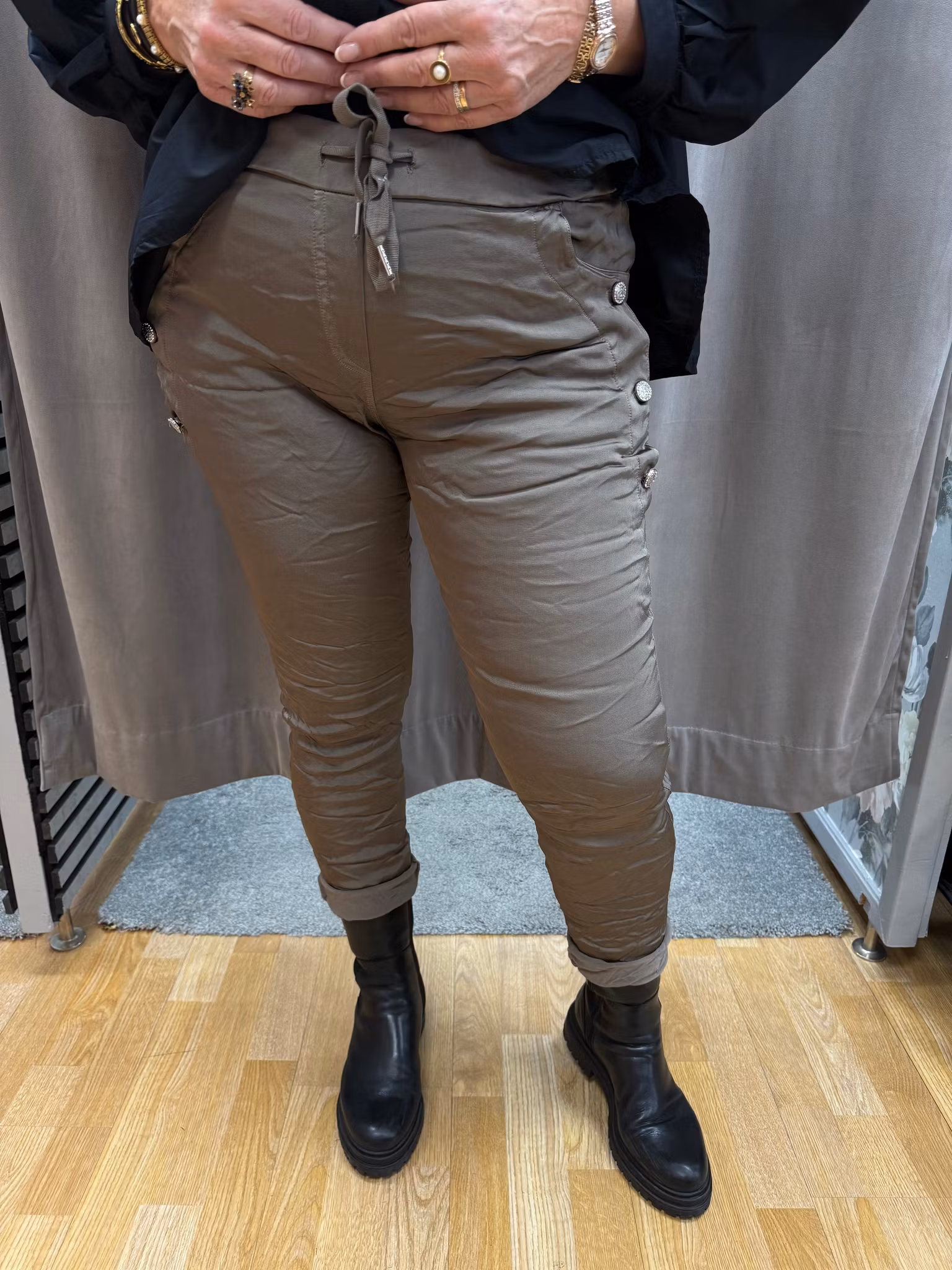 Dessa taupefärgade magiska byxor i one size kombinerar stil och komfort i ett och samma plagg. Byxorna har en smickrande passform med lätt glansigt tyg och dekorativa silverfärgade knappar vid fickorna som ger en exklusiv och kvinnlig touch.