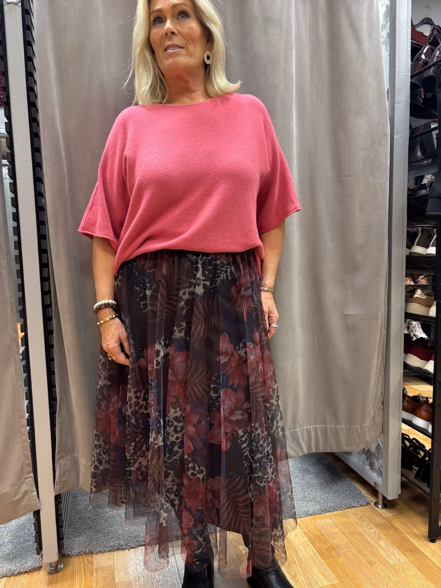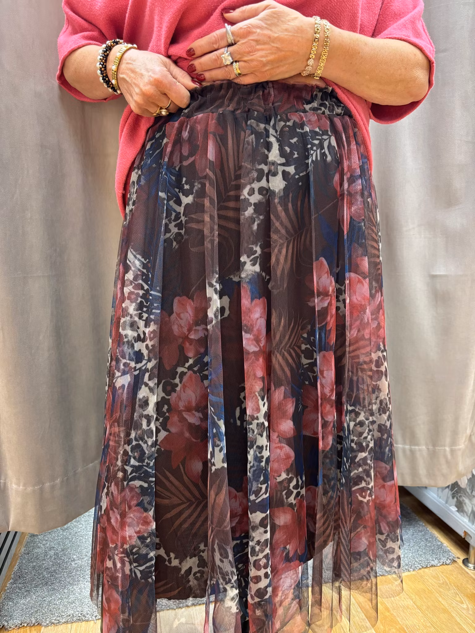 Elegant meshkjol med vackert blommigt och mönstrat övertyg som ger ett levande och exklusivt uttryck. Kjolen har ett mjukt och följsamt foder som gör den bekväm att bära och ger en fin siluett. Det lätt utställda fallet skapar rörelse och ger plagget en luftig, feminin känsla. Perfekt att kombinera med både stickade tröjor och enklare toppar för en stilfull vardags- eller festlook.
