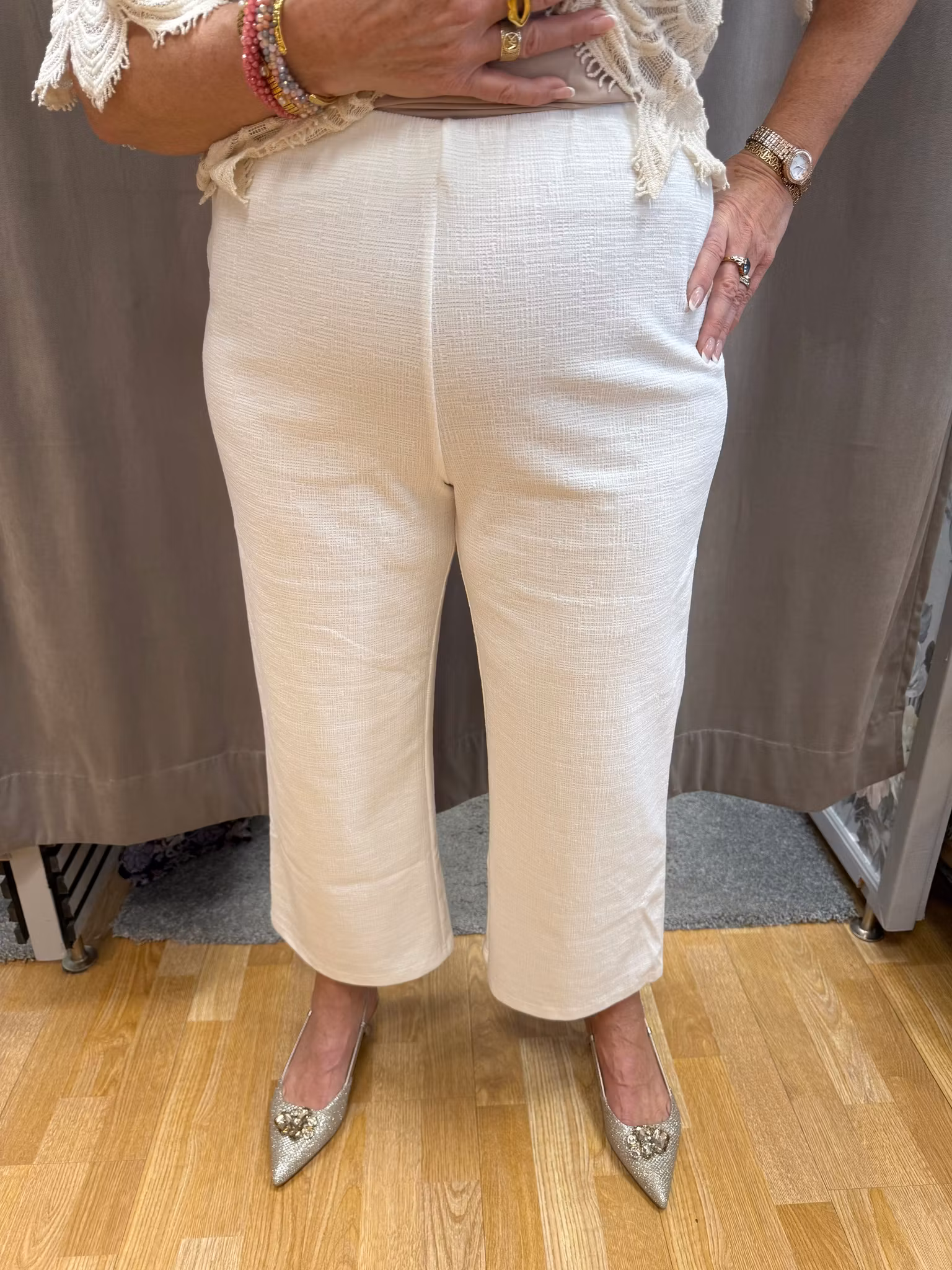 Den elastiska midjan gör byxorna extra sköna att bära och ger en flexibel passform. Perfekta både till vardag och mer uppklädda tillfällen – lika fina till blus som till en enkel topp.