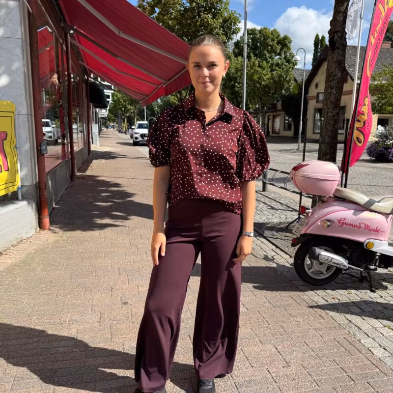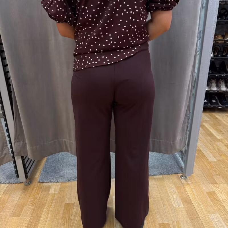 En vinröd (Bordeaux) byxa med hög midja i stretchigt material utan knapp och dragkedja. Modellen är 168 cm och bär storlek S. Material: 95% polyester, 5% elastan.
