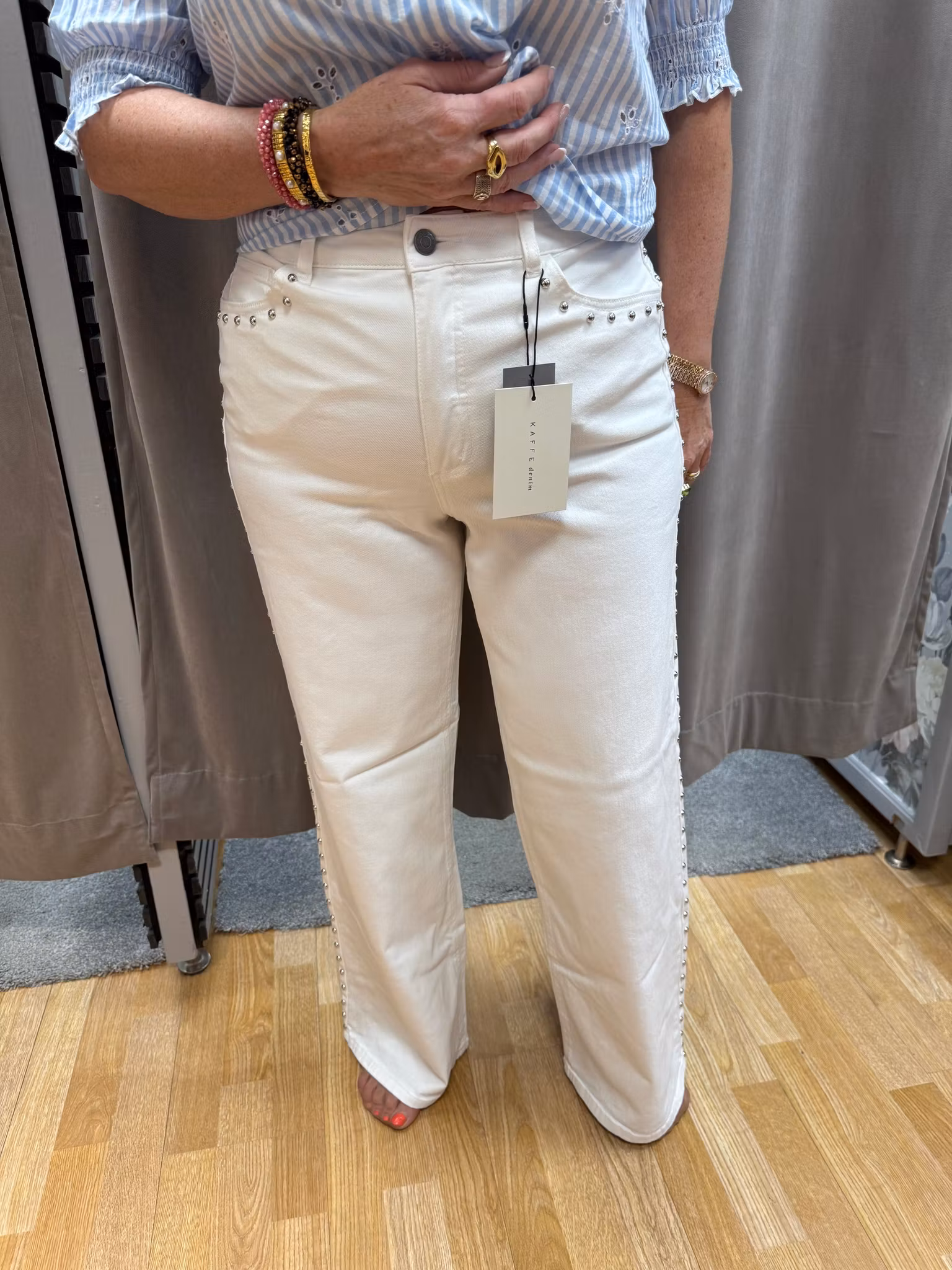 Stilrena vita byxor med dekorativa nitar längs sidorna som ger en modern och lite tuff detalj till en annars klassisk modell. Byxorna har en bekväm passform med stretch som gör dem sköna att bära hela dagen. Den raka, lätt utsvängda benen ger en smickrande silhuett och passar lika bra till sneakers som till en mer uppklädd sko.