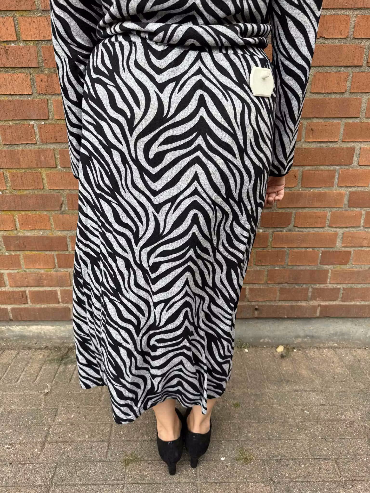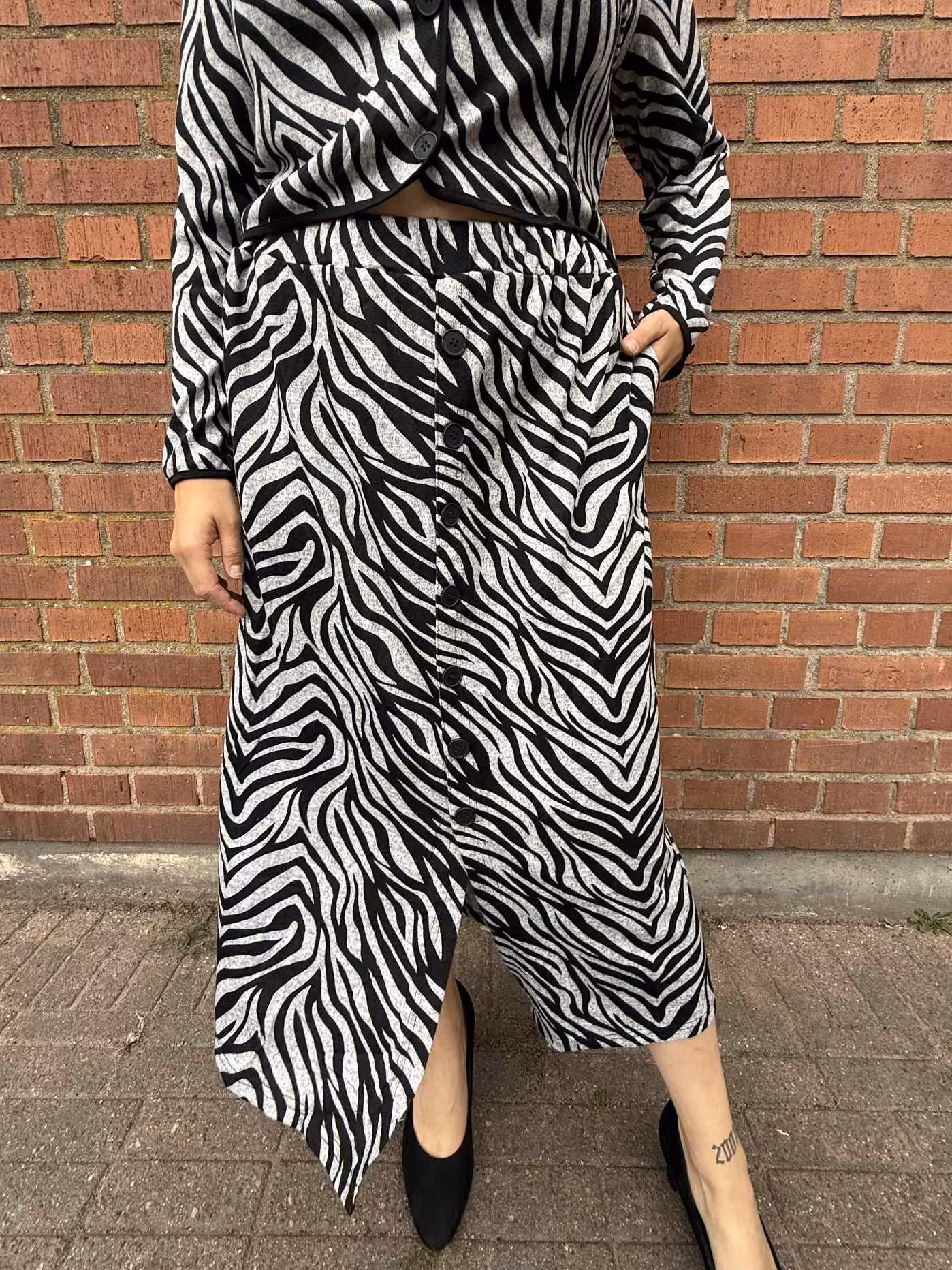 Stilfull zebramönstrad kjol i svart och grått med knappdetaljer framtill. Kjolen har bekväm midja med resår och praktiska fickor. Perfekt för både vardag och fest för en trendig och modern look.