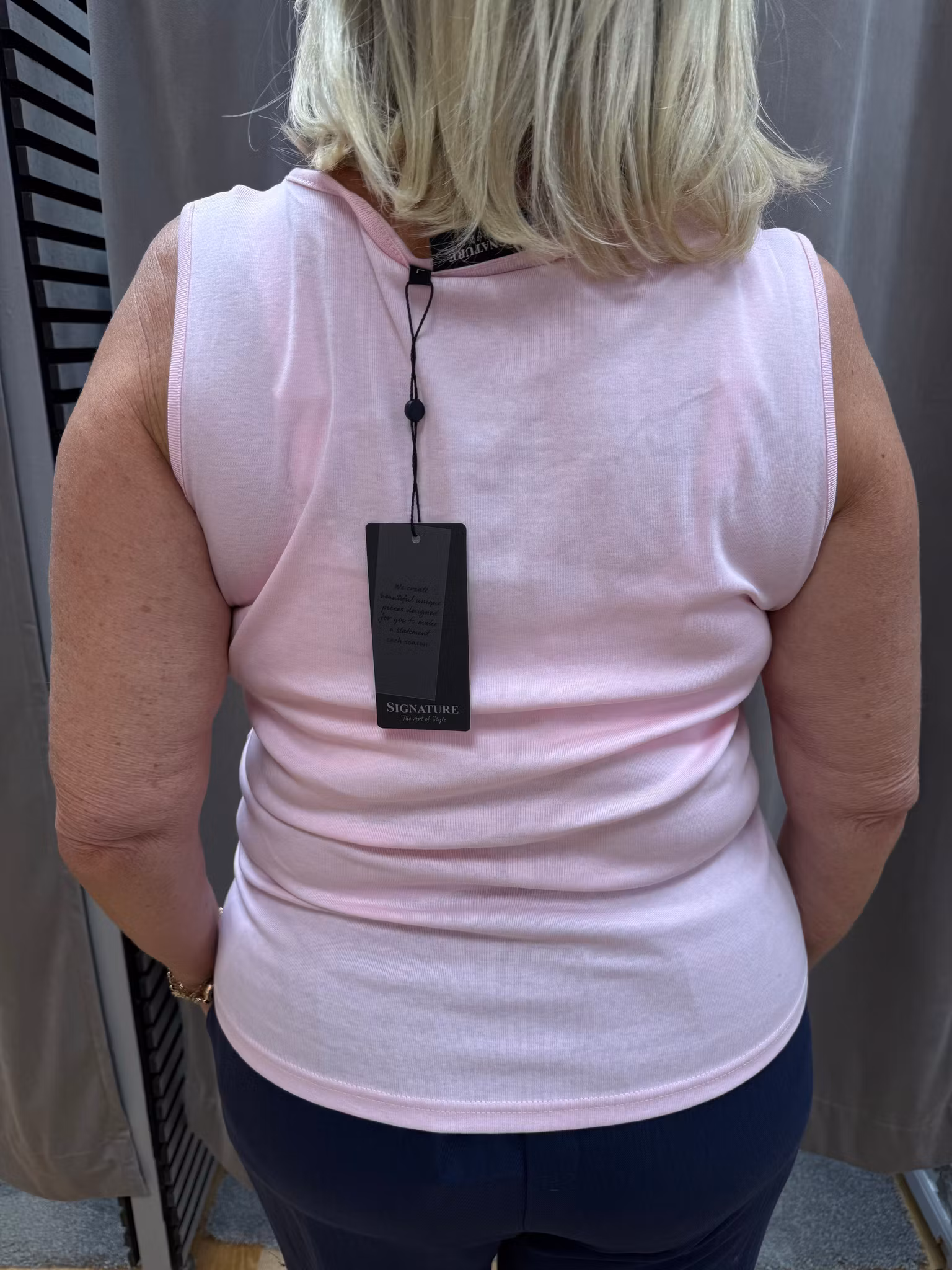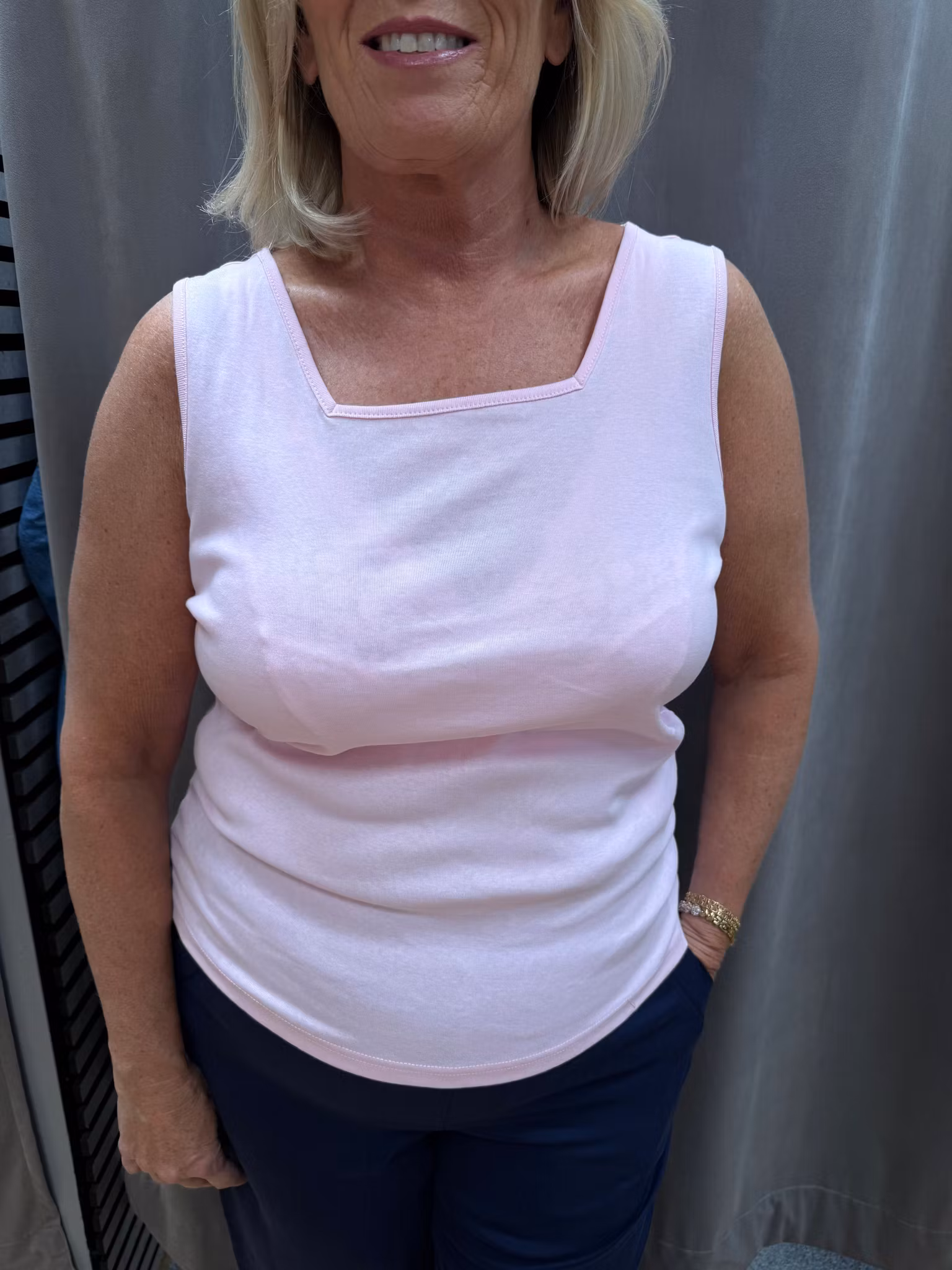 Elegant och bekvämt linne i mjuk och stretchig kvalitet som sitter smickrande mot kroppen. Toppen har bred axel och en stilren fyrkantig halsringning, vilket ger ett feminint och klassiskt uttryck. Den ljusrosa färgen är mjuk och lätt att matcha – perfekt som basplagg i garderoben.