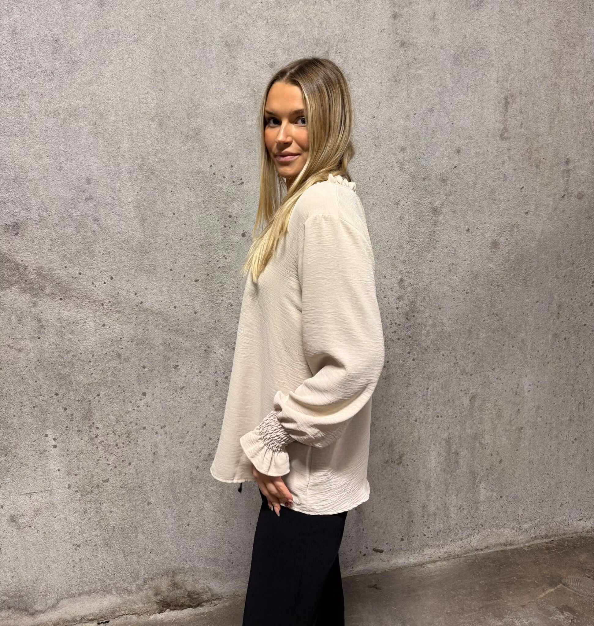 Elegant och lättburen basblus i mjuk viskosmix med vacker V-ringning och smockade ärmslut som ger en feminin och stilren silhuett. Modellen är luftig, följsam och passar lika bra till vardag som till fest.