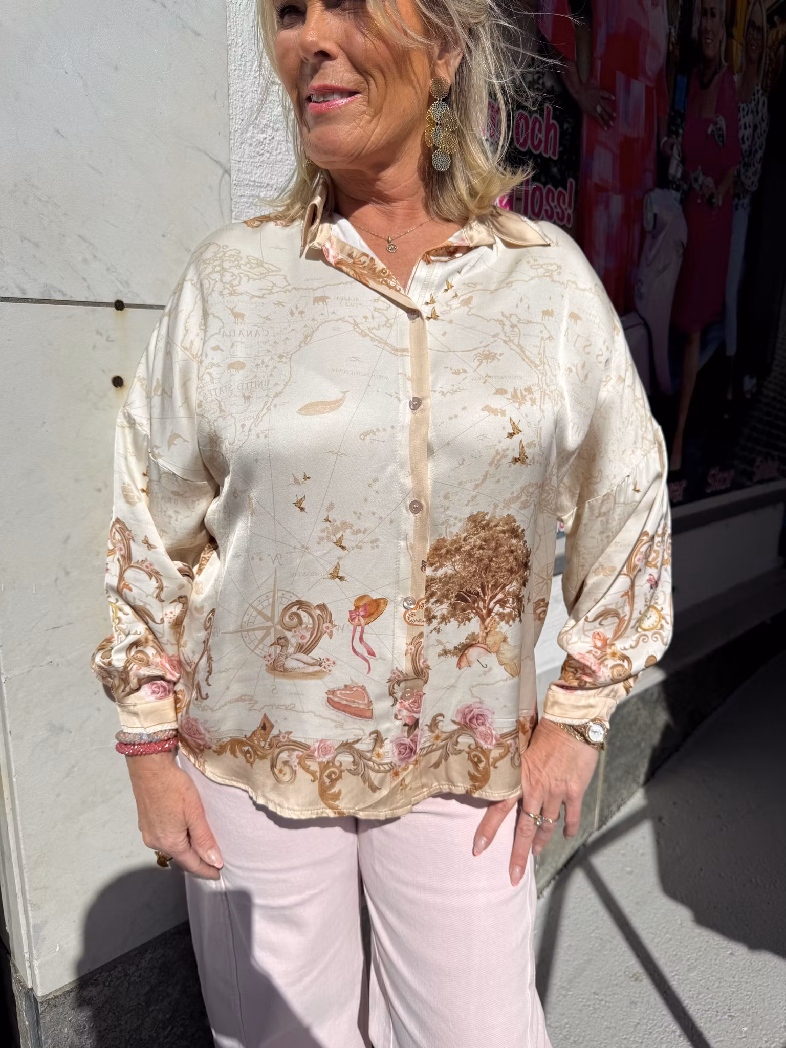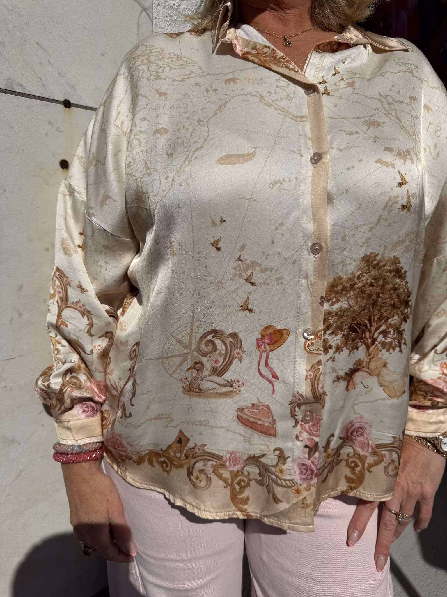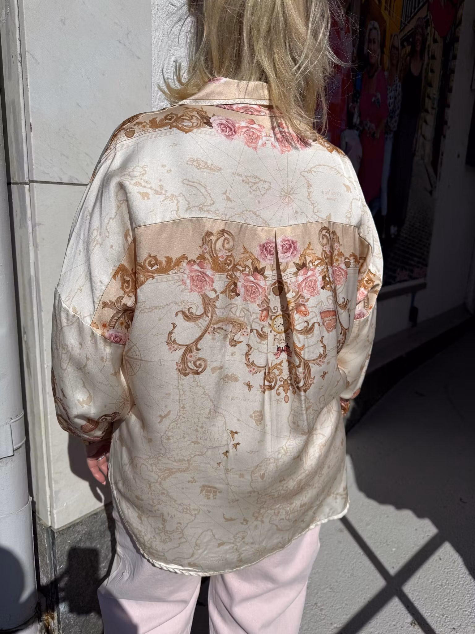 En uttrycksfull skjortblus med ett konstnärligt och romantiskt mönster som kombinerar dekorativa element, naturmotiv och subtila gulddetaljer för en exklusiv känsla. Ett plagg som verkligen sticker ut och ger din outfit det lilla extra.