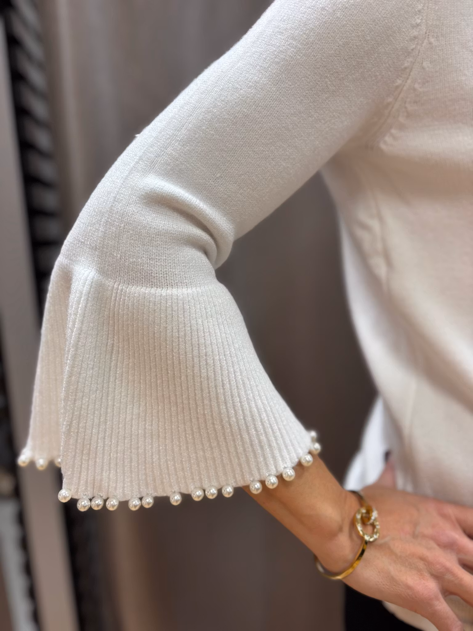 Elegant stickad tröja med feminina detaljer. Tröjan har rund halsringning och lätt utsvängda ärmar dekorerade med vackra pärlor längs fållen. Den mjuka, stretchiga kvaliteten gör den bekväm och perfekt för både vardag och fest. En stilren topp med det lilla extra som passar till både kjol och byxor.