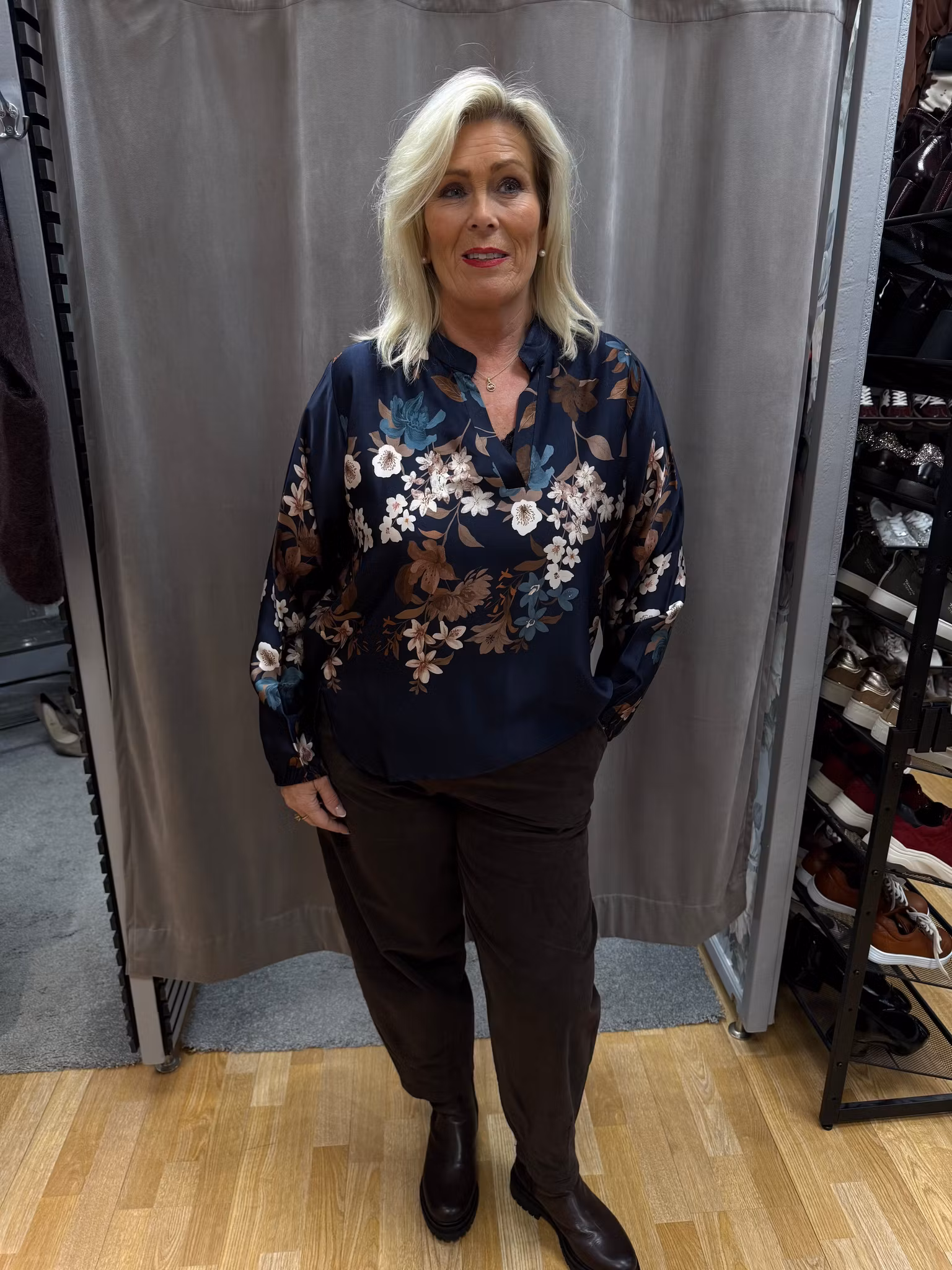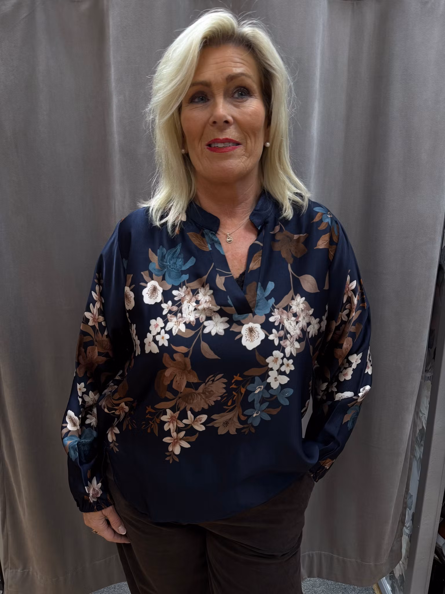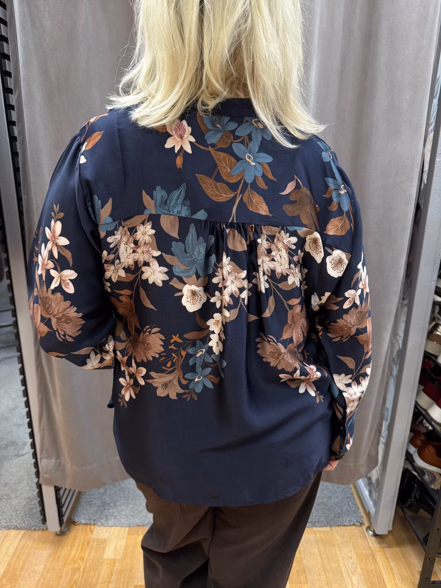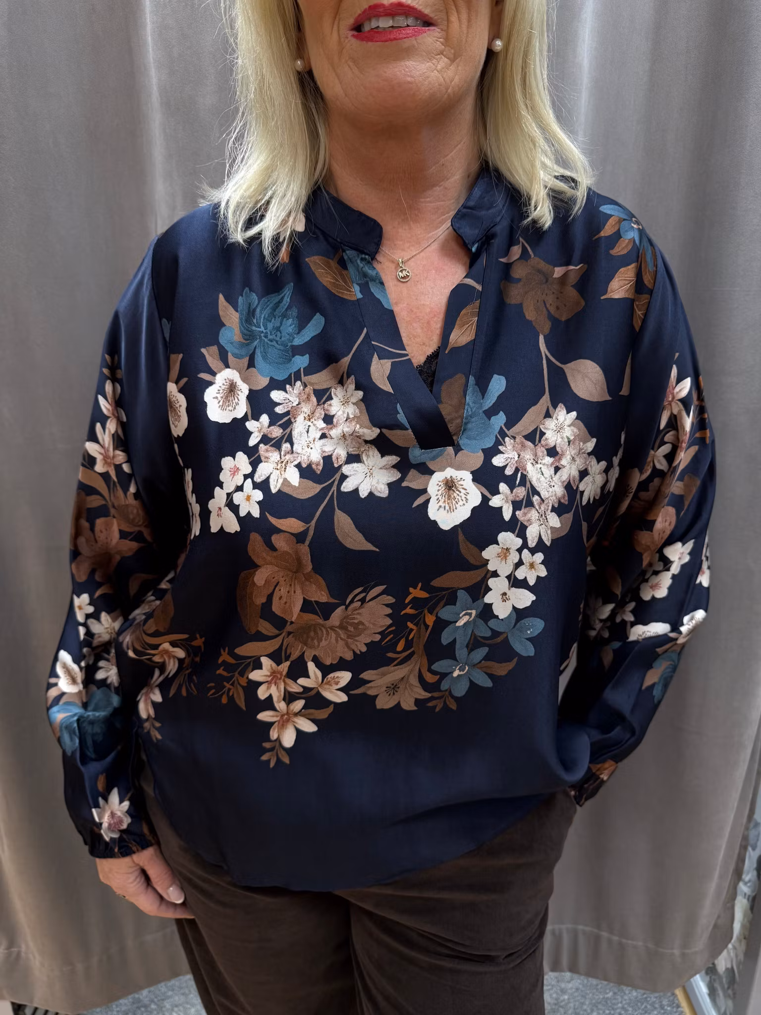 Elegant blommig satintopp i en djup marinblå nyans med vackert tryck av beige, rosa och turkosa blommor. Tillverkad i ett lätt och glansigt tyg som ger en lyxig känsla. Toppen har V-ringning, långa ärmar och en något längre baksida som ger en avslappnad och smickrande passform. Perfekt både till vardags och fest – matcha med jeans för en avslappnad look eller med kjol/byxor för en mer uppklädd stil.