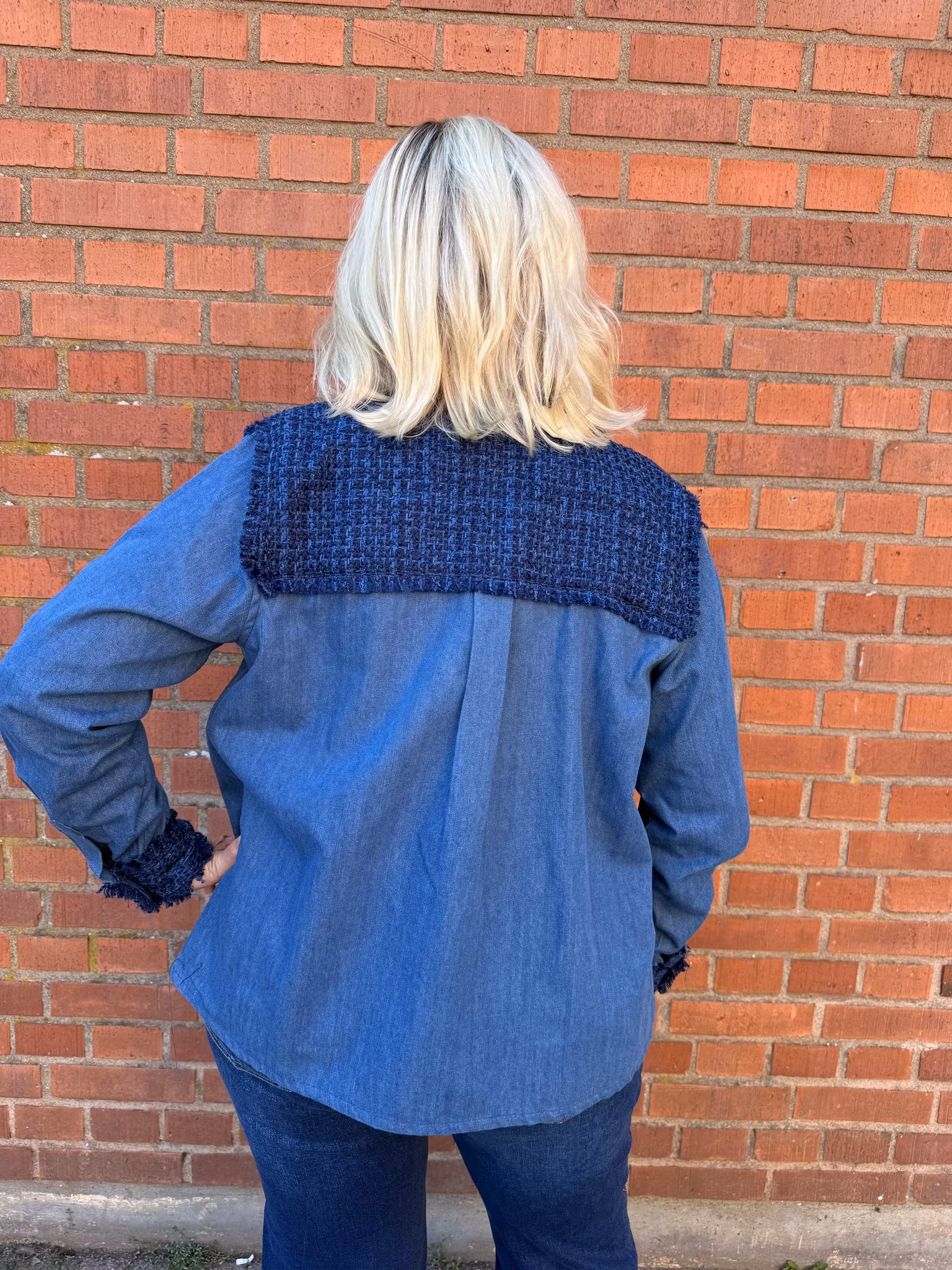 Jeans overshirt med tweeddetaljer. Unik och trendig overshirt med mörkblå tweeddetaljer på axlar, bröstfickor, manschetter och knappslå. Modellen har guldknappar framtill och på fickorna som ger en elegant kontrast. Perfekt som både skjorta och lätt jacka, att styla med jeans för en denim-on-denim-look eller med kjol/byxor för en chic vardagsstil.