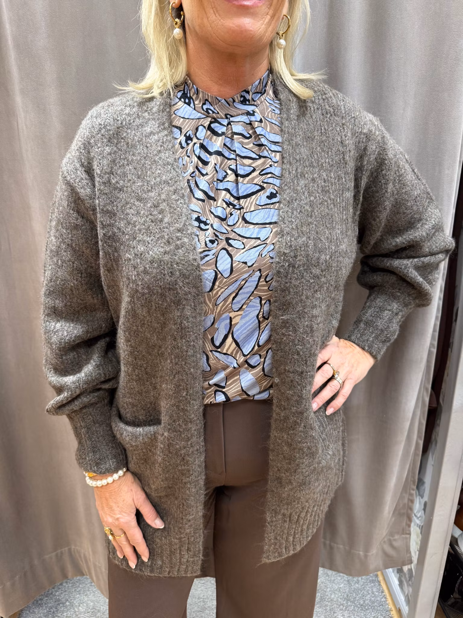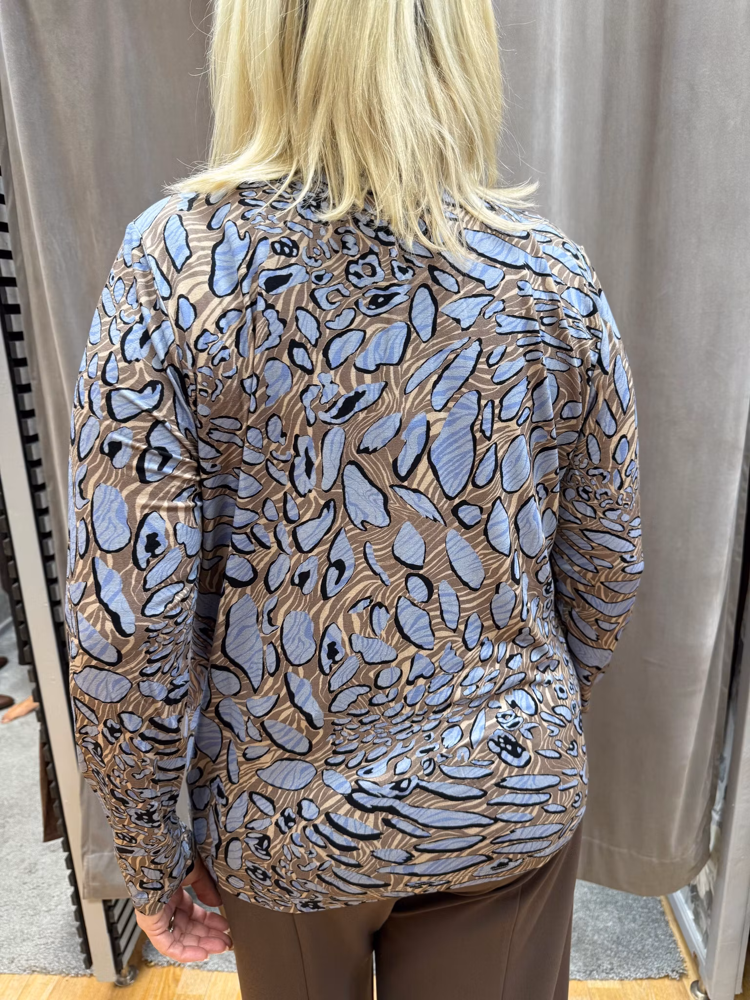 Elegant och uttrycksfull blus från Signature med ett konstnärligt, abstrakt mönster i mjuka nyanser av ljusblått, beige och svart. Tillverkad i ett följsamt och lätt tyg som ger en skön passform och fint fall. Blusen har rund halsringning, långa ärmar med diskreta rynkdetaljer vid ärmsluten samt en lös, avslappnad silhuett som ger en sofistikerad men bekväm look. Perfekt att bära både till kontoret och till vardags med jeans eller en kjol.