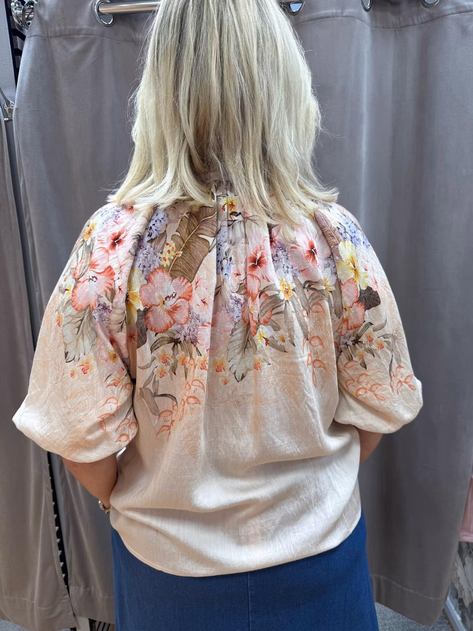 Blusen har en klassisk knäppning framtill och korta, vida ärmar med lätt puff som skapar en mjuk siluett. Den ljusa basen tillsammans med de dämpade blomdetaljerna gör den enkel att matcha – perfekt både till jeans och mer uppklädda looks.