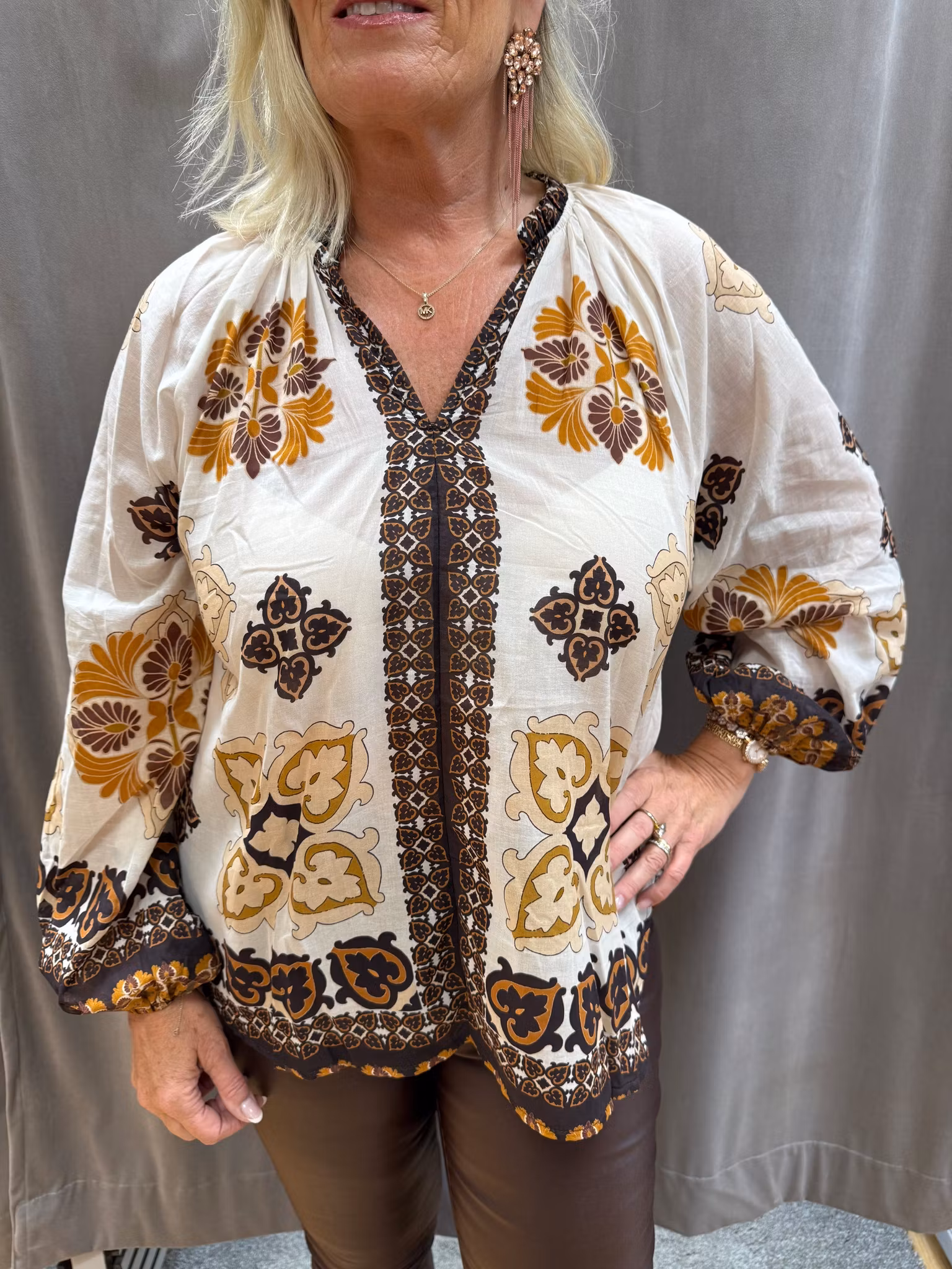 Denna bohemiska blus i lätt och luftigt tyg har ett vackert mönster i bruna, beige och senapsgula toner som ger en varm och jordnära känsla. Modellen har v-ringad hals, lös passform och långa ärmar med resår i ärmsluten som skapar en mjuk ballongeffekt. Perfekt att bära både till vardags och fest, lika snygg till jeans som till skinnbyxor eller kjol. En tidlös blus som ger en avslappnad men stilfull look.