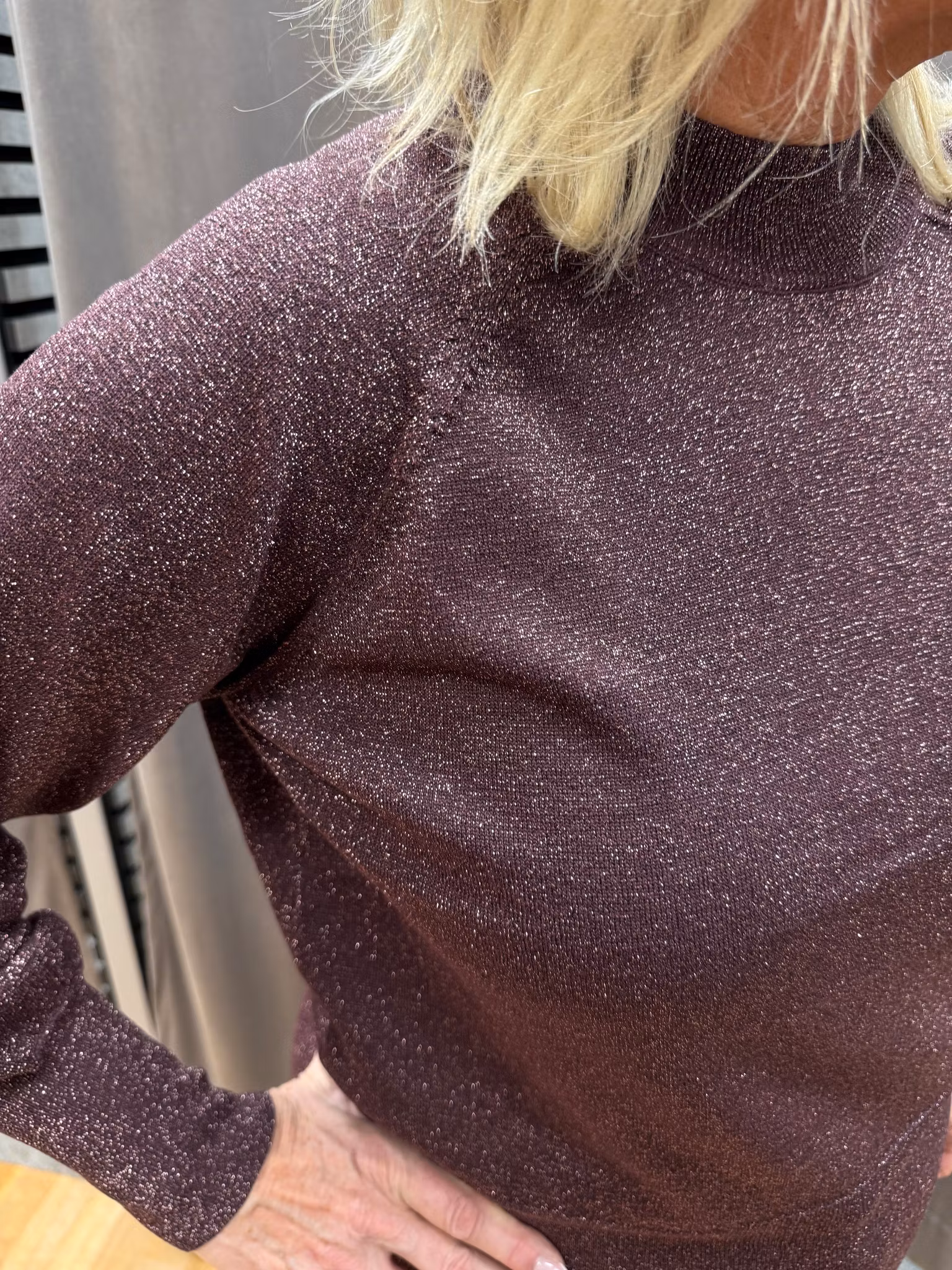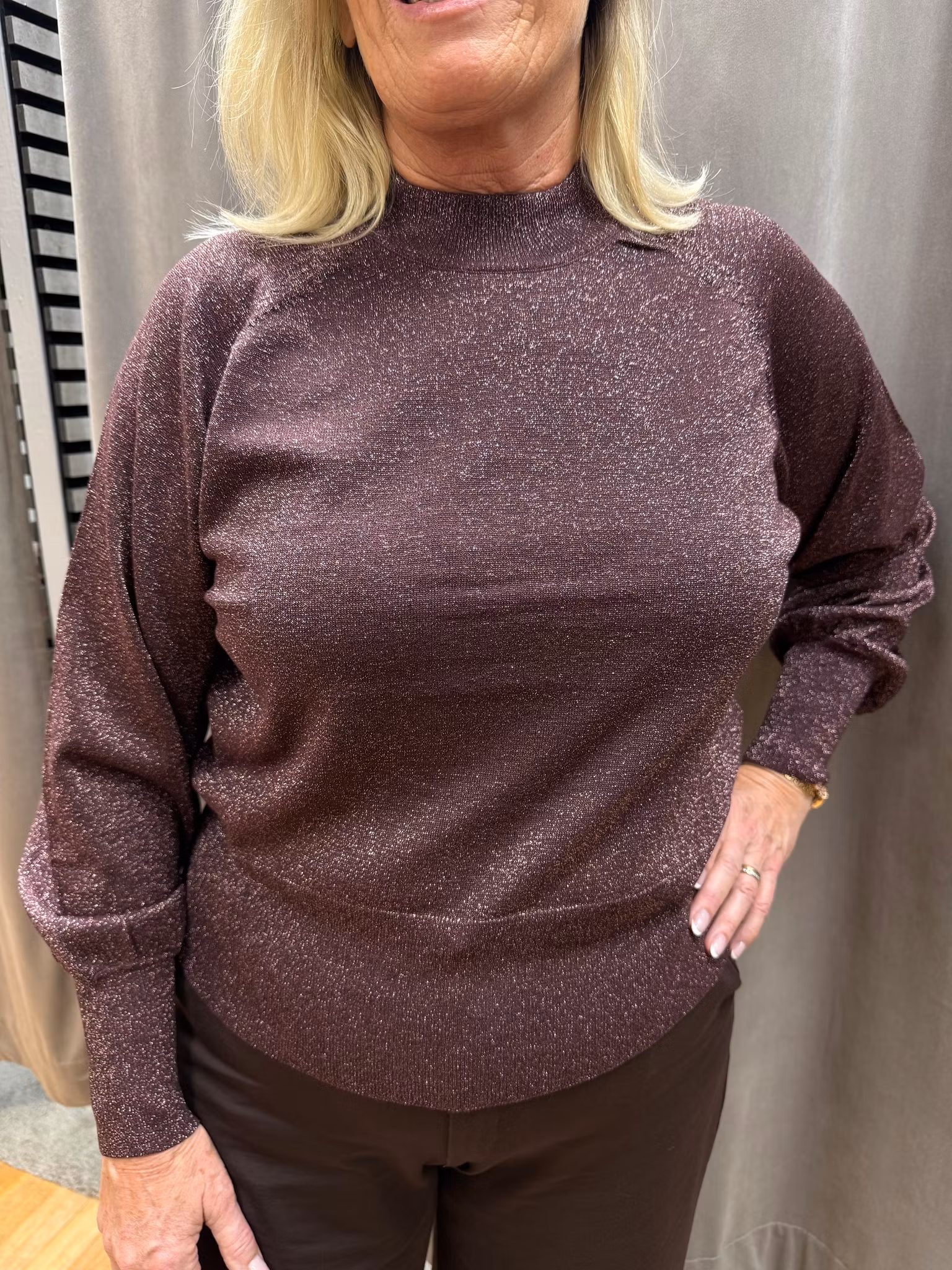 Glittrig topp från b.young. En elegant tröja i skimrande vinröd ton med lätt glansig finish som ger en festlig känsla. Modellen har lång ärm med diskret puffdetalj vid ärmslutet och en rak passform som gör den bekväm och lätt att bära. Perfekt till både fest och vardag – kombinera med kjol, kostymbyxor eller jeans för en stilfull look.