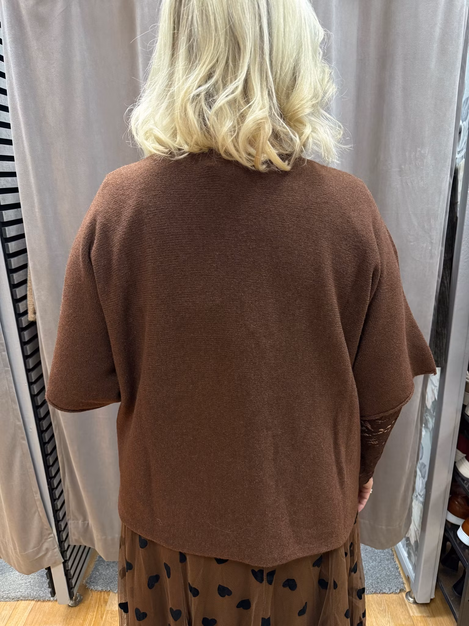 Brun kortärmad stickad tröja i mjukt och lätt material. Tröjan har en ledig passform med diskret struktur och rund halsringning som gör den enkel att bära både till vardag och mer uppklädda tillfällen. De korta, vida ärmarna ger ett luftigt och elegant fall, och längden gör den perfekt att kombinera med både kjol och byxa. Ett bekvämt och stilrent plagg som alltid är ett säkert kort.