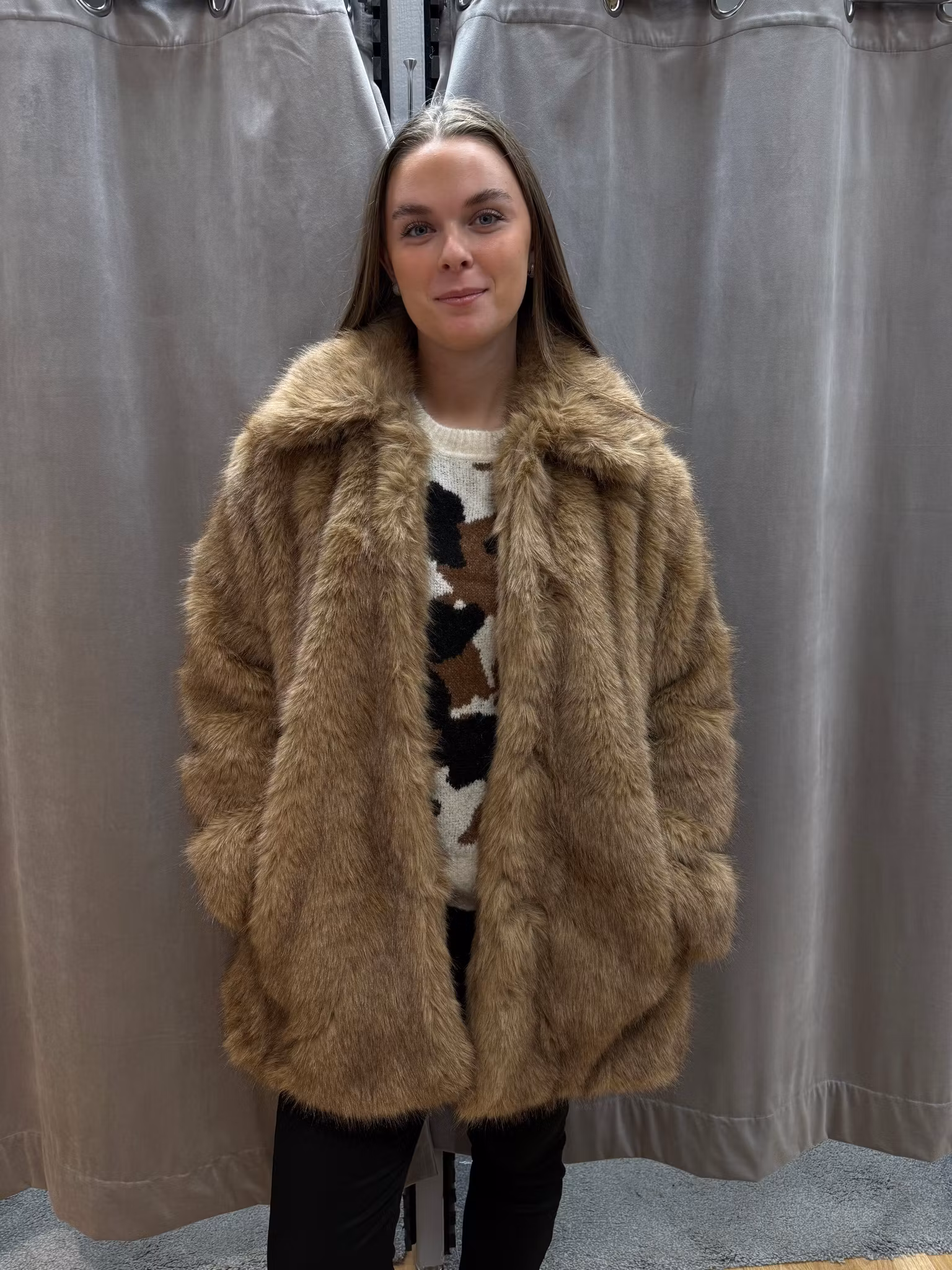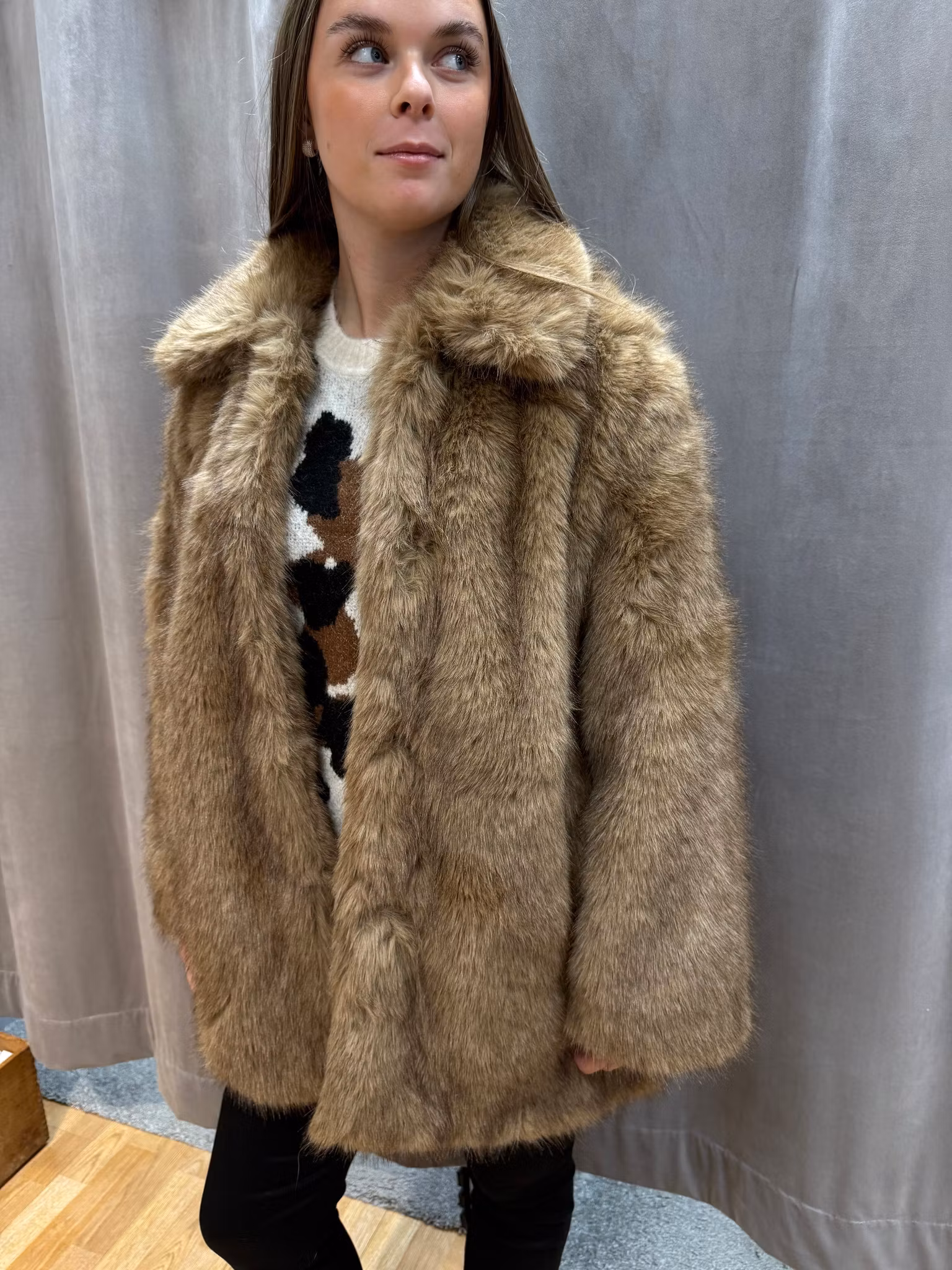Stilren och varm fuskpälsjacka i beige/brun ton – perfekt för höst och vinter. Denna fuskpäls har en mjuk och lyxig känsla, med en klassisk krage och rak passform som ger en chic och tidlös look. Jackan passar lika bra till vardags som till fest. Kombinera med jeans eller klänning för en komplett outfit. Ett måste i garderoben för dig som vill vara trendig och hållbar!