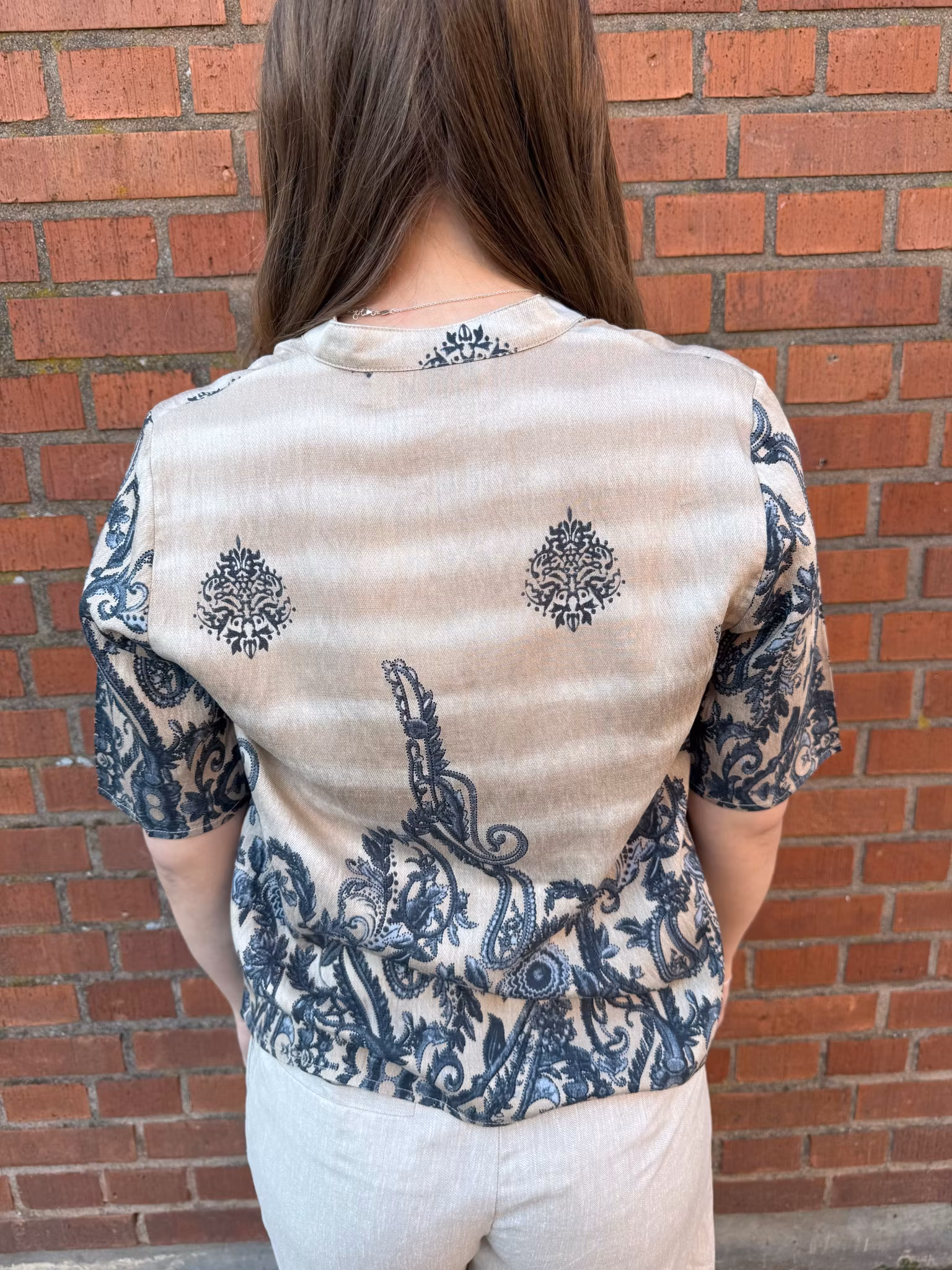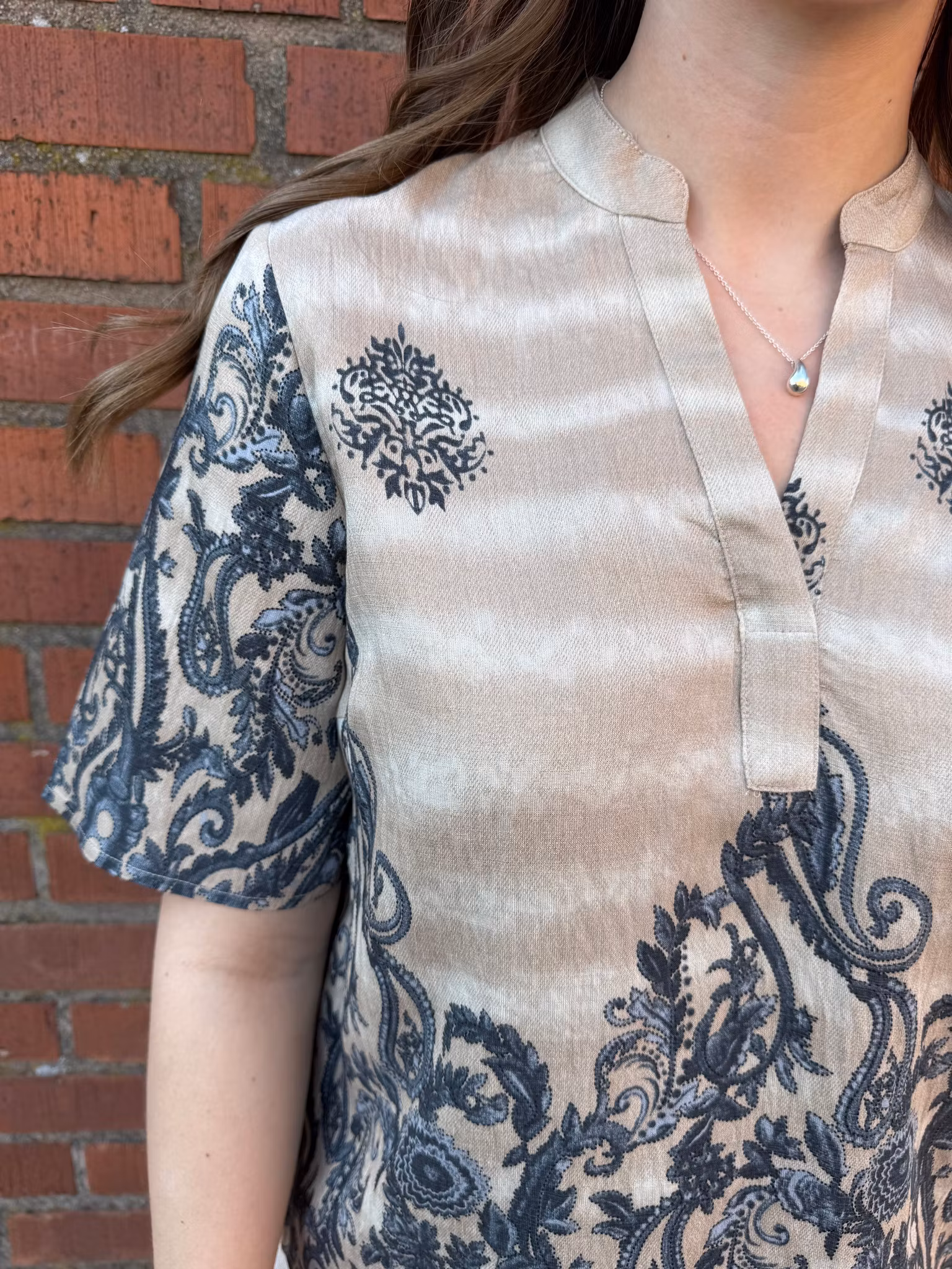 En elegant och stilfull mönstrad blus i sand- och beige toner som ger ett sofistikerat och modernt uttryck. Blusen har ett dekorativt paisleymönster i mörkare nyanser som skapar en fin kontrast mot den ljusa bakgrunden.