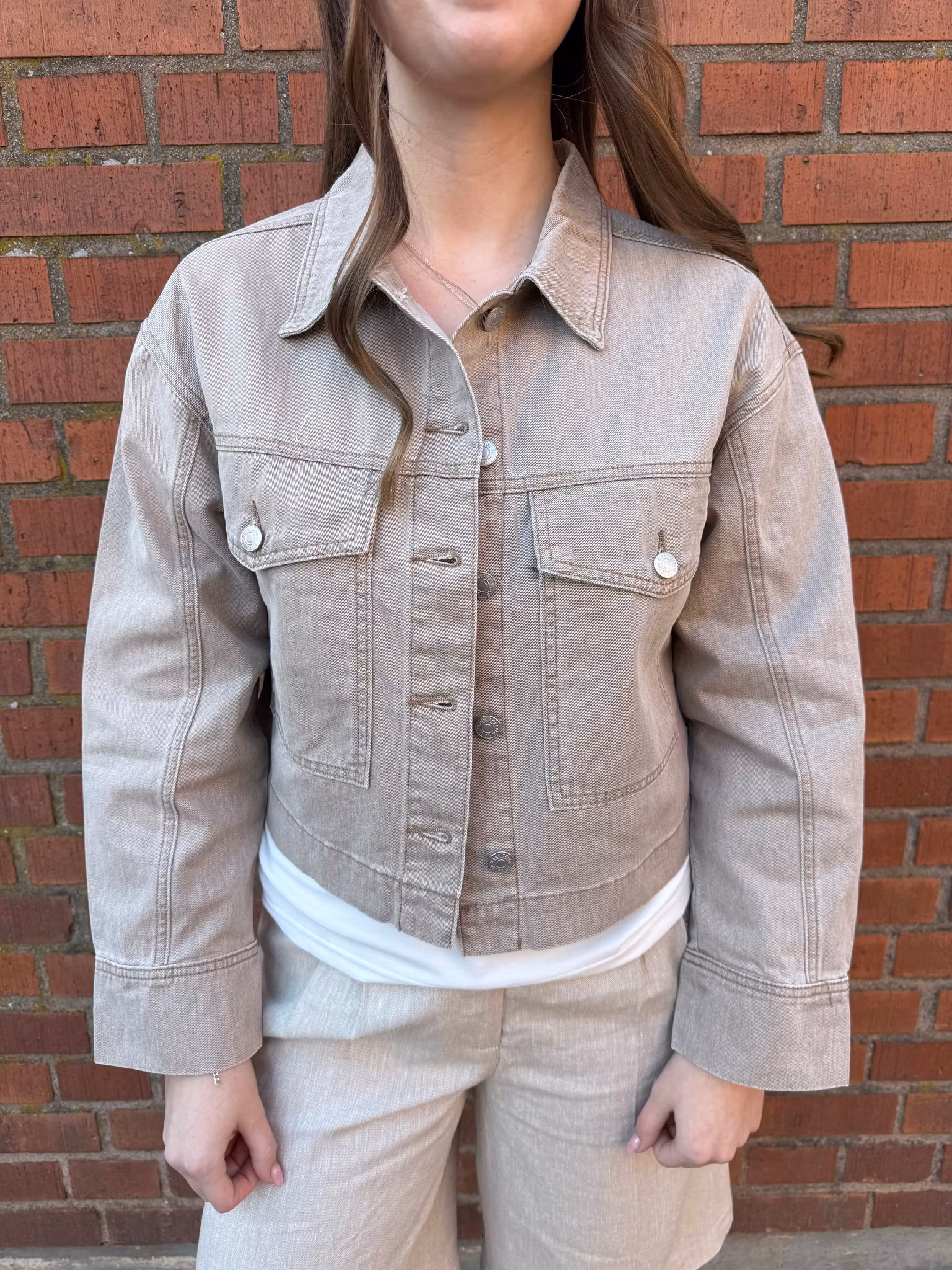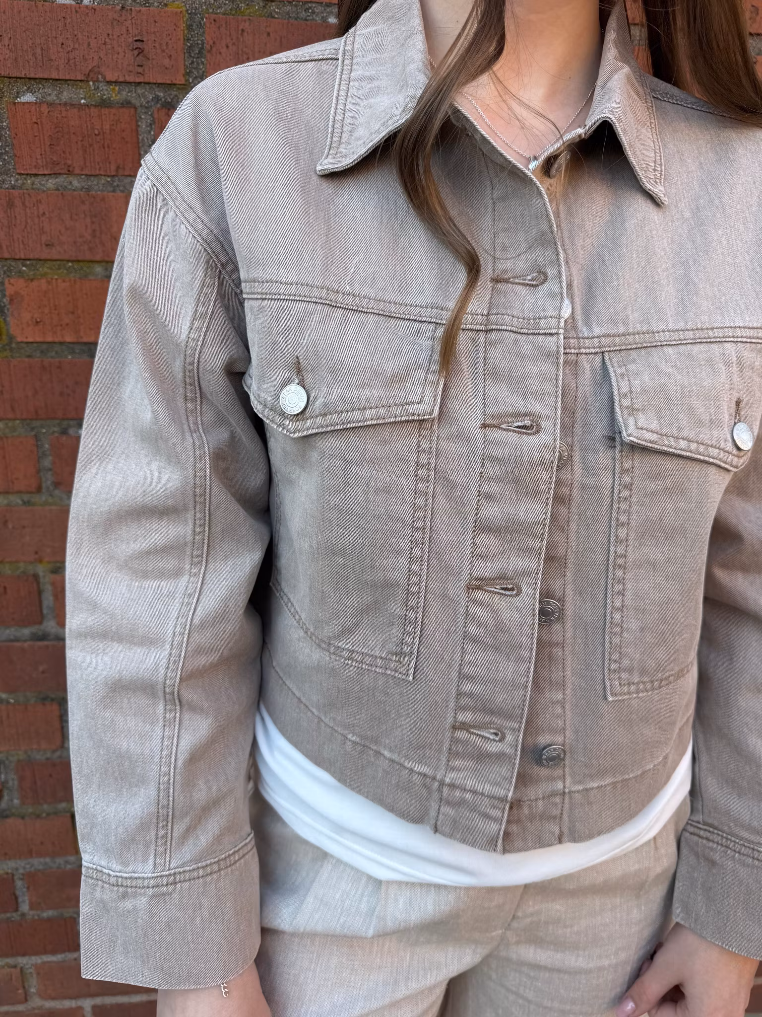 En stilren och trendig sandfärgad jeansjacka som kombinerar klassisk denimdesign med en modern och feminin känsla. Jackan har en tidlös modell med krage, knappar framtill och praktiska bröstfickor som ger ett avslappnat men stilrent uttryck.