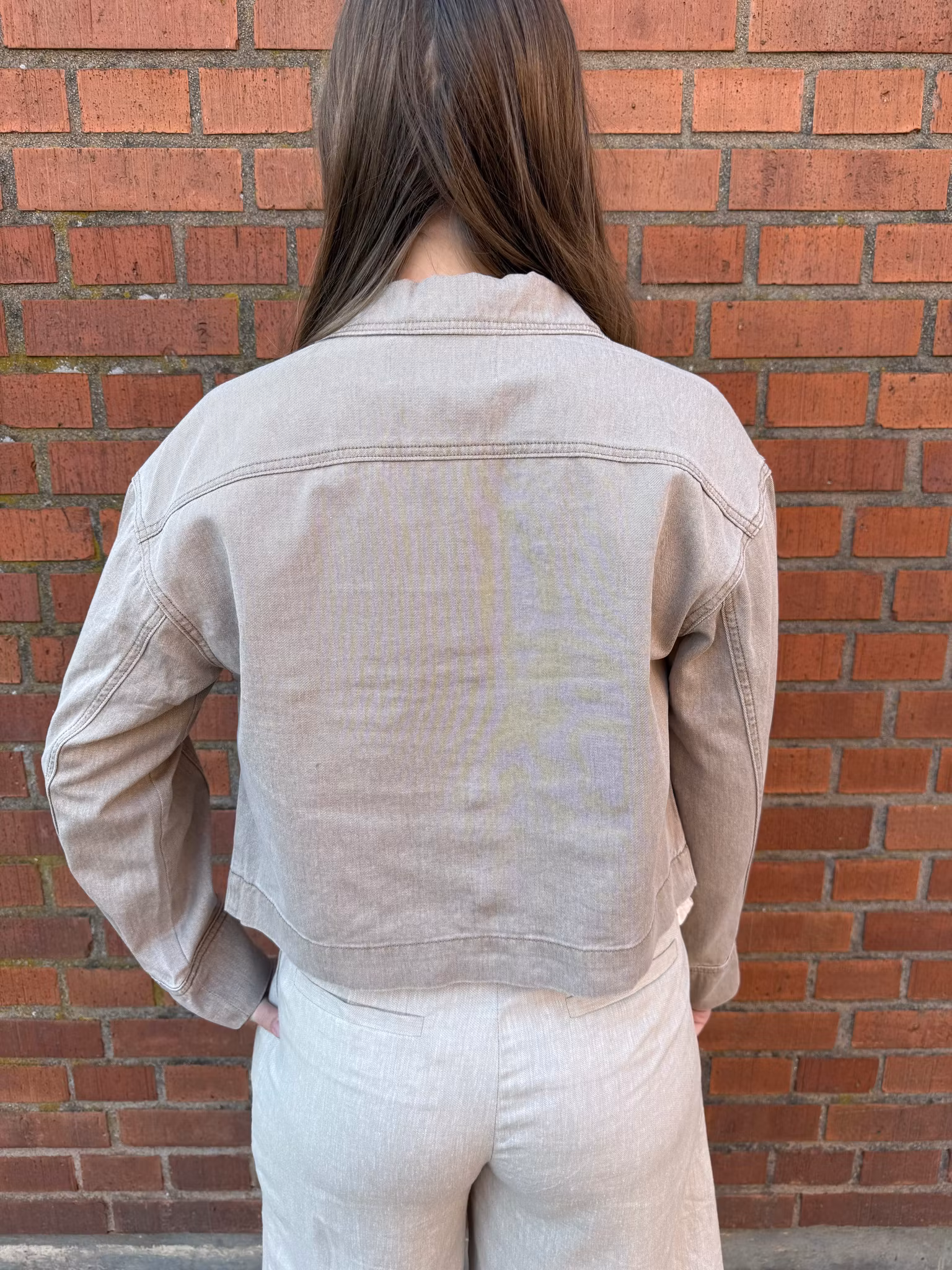 Den mjuka sandfärgade tonen gör jackan enkel att matcha med många olika outfits och passar perfekt till både jeans, klänningar och kjolar. Materialet är i stadig men bekväm denim som håller formen och gör jackan till ett mångsidigt plagg i garderoben.