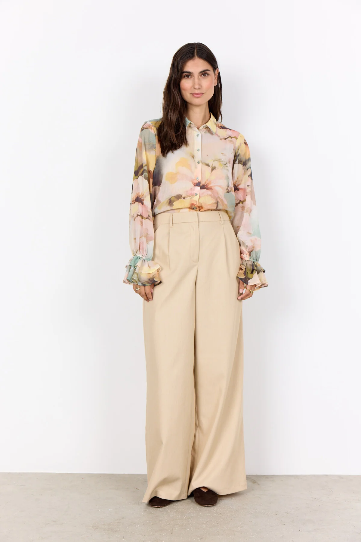 En skjorta tillverkad av 100% återvunnen polyester. Den har en spetsig krage, knappslå framtill och volangmanschetter med ett elegant blommönster. Matcha den med skräddarsydda byxor eller en snygg kjol för en cool look.