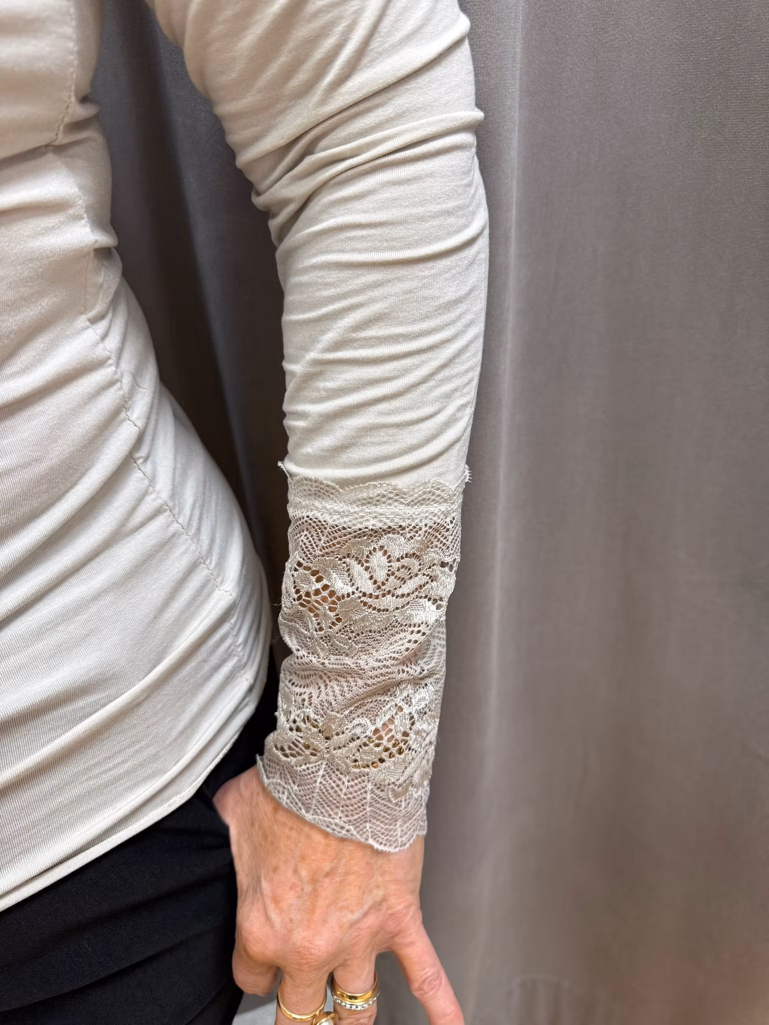 Mjuk och stilren långärmad topp med en rund halsringning och dekorativa spetsdetaljer vid ärmsluten som ger ett feminint och elegant uttryck. Den lätta och följsamma kvaliteten gör den bekväm att bära både till vardags och vid mer uppklädda tillfällen. Finns även i ljus beige för den som föredrar en ljusare look.