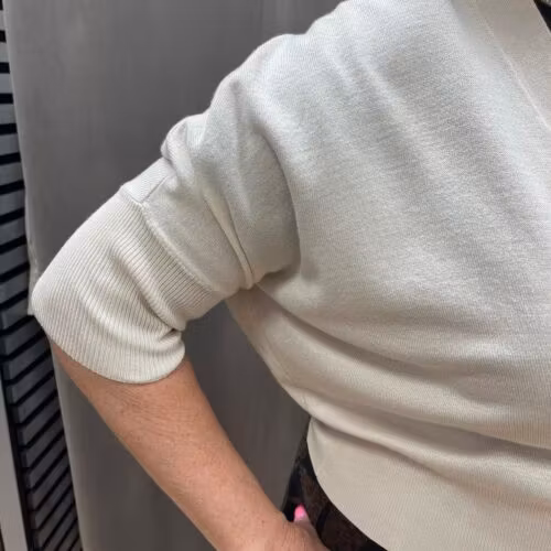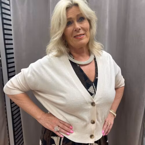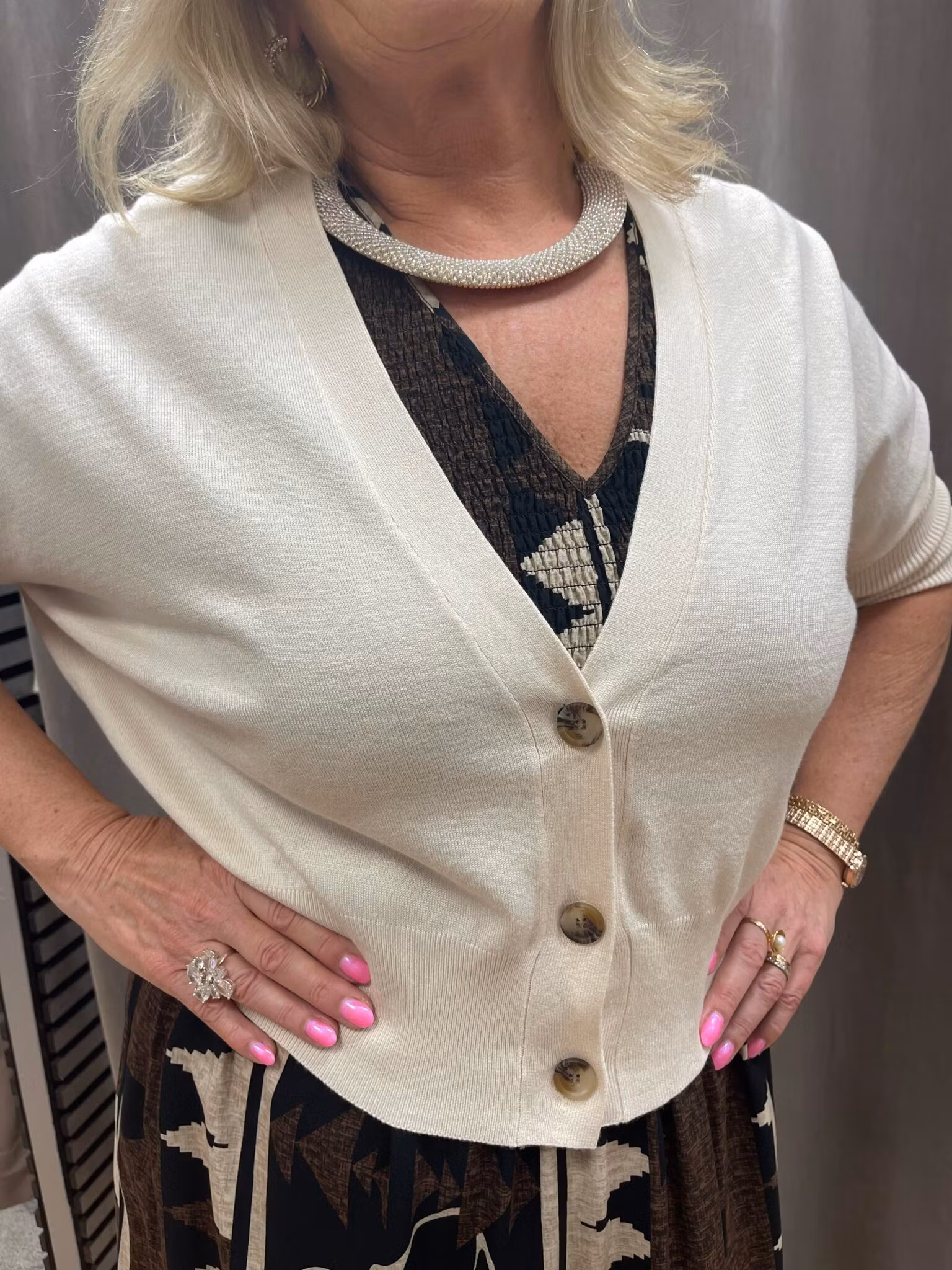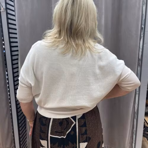 Crème vit kofta med pingvinärm. Snygg att använda som den är eller utanpå en topp eller klänning. Modellen är 172cm och bär storlek L. 75% viscose 25% nylon