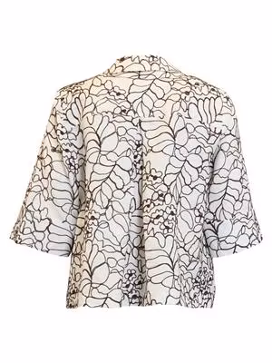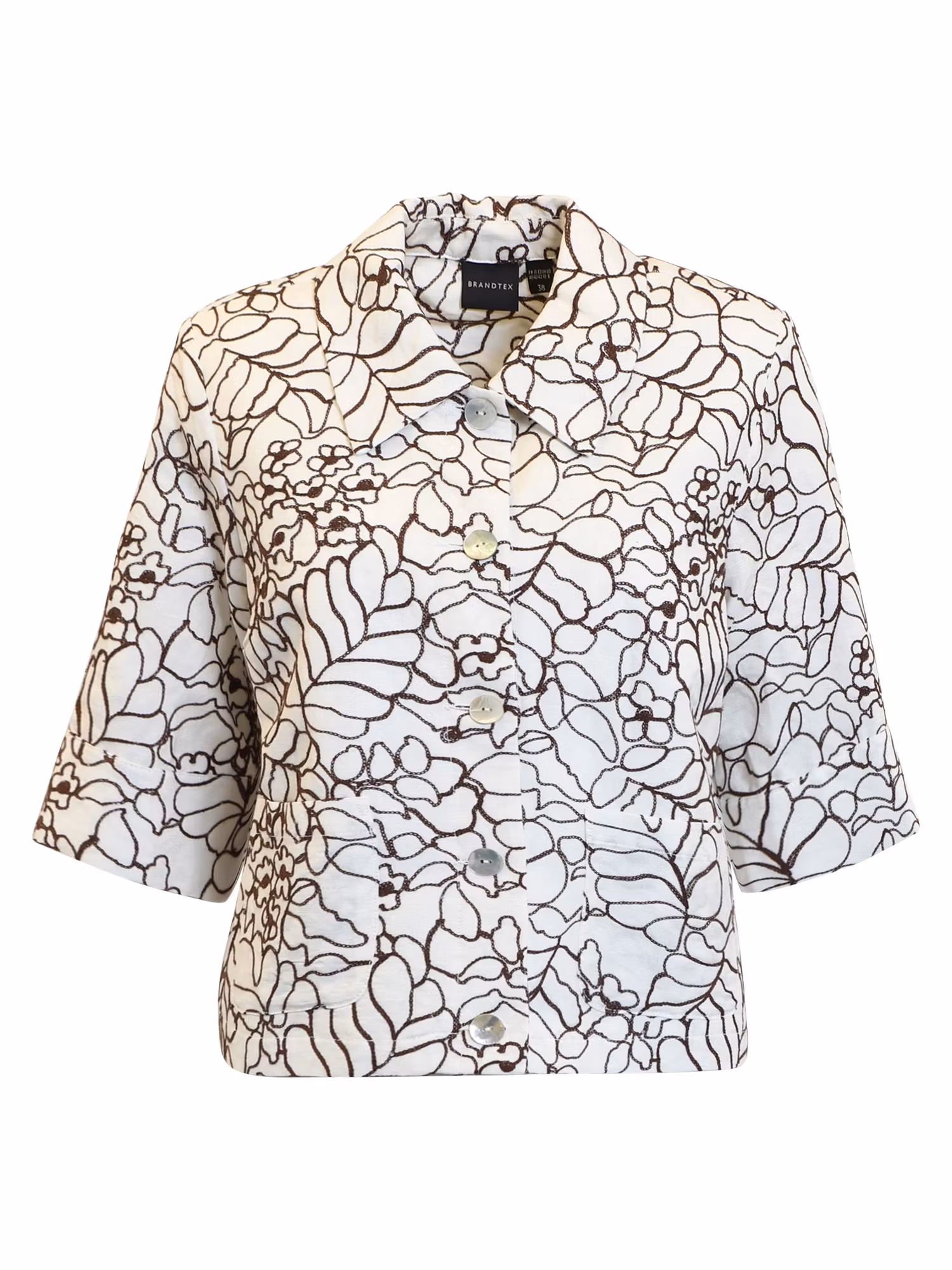 En stilren och luftig linnejacka i cremevit nyans med dekorativt broderat mönster som ger ett exklusivt och handgjort uttryck. Den kortare modellen tillsammans med de vida, korta ärmarna skapar en modern silhuett – perfekt för varmare dagar.
