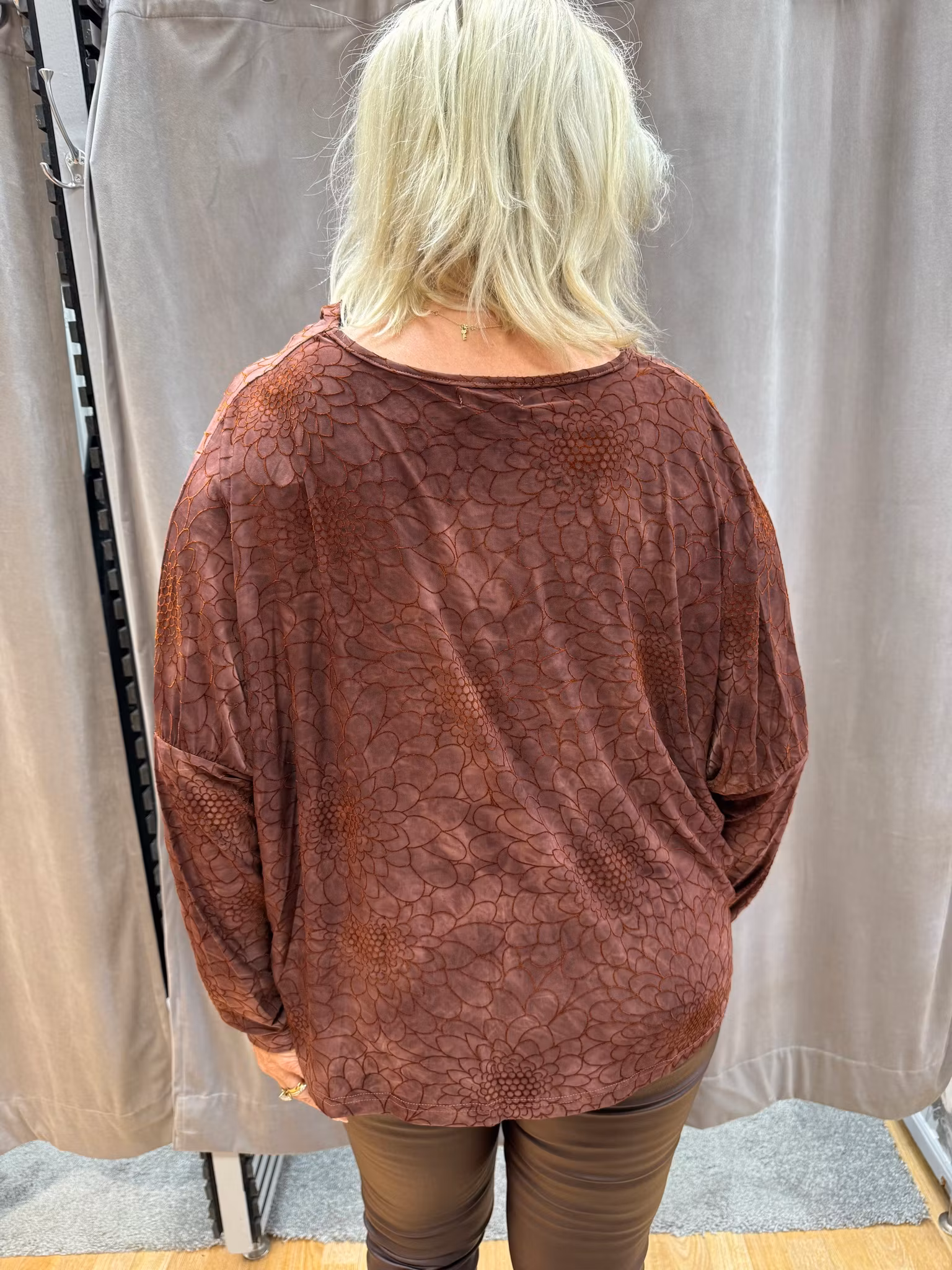 Denna eleganta topp i varmt brunt har en vacker draperad halsringning som ger en sofistikerad och feminin look. Tyget har ett subtilt blommönster i ton-i-ton med en lätt glans som gör plagget både stilfullt och unikt. Med sin lediga passform och långa ärmar är den bekväm att bära och enkel att styla till både vardags och fest. Perfekt till skinnbyxor, kjol eller jeans för en chic och modern outfit.