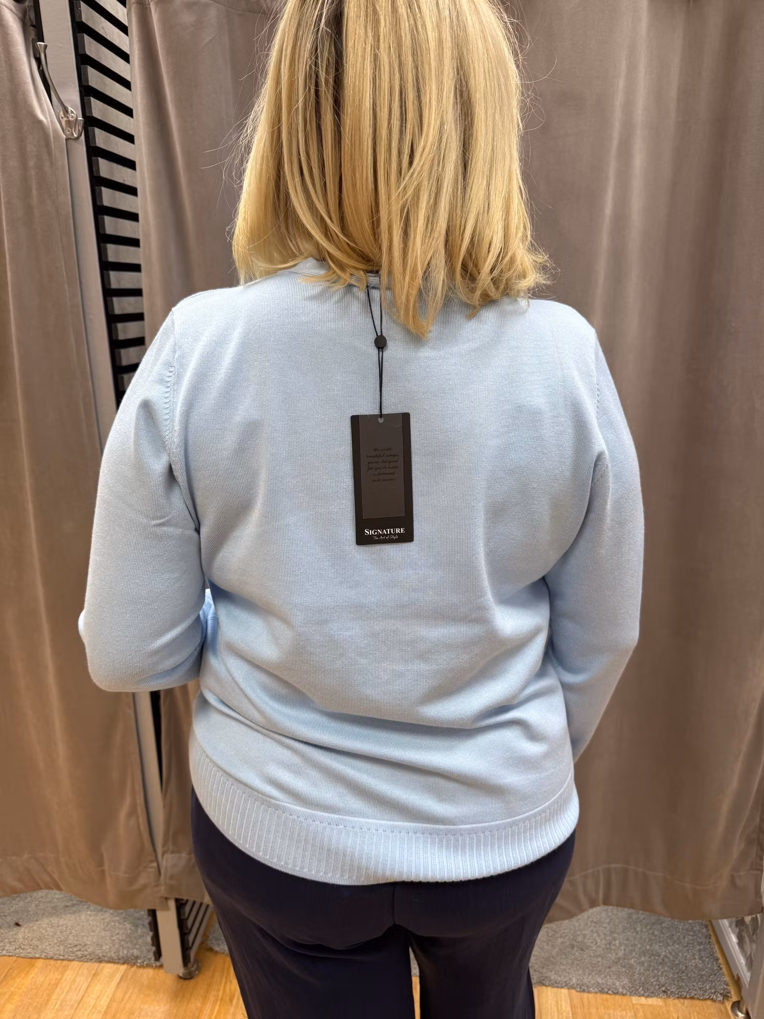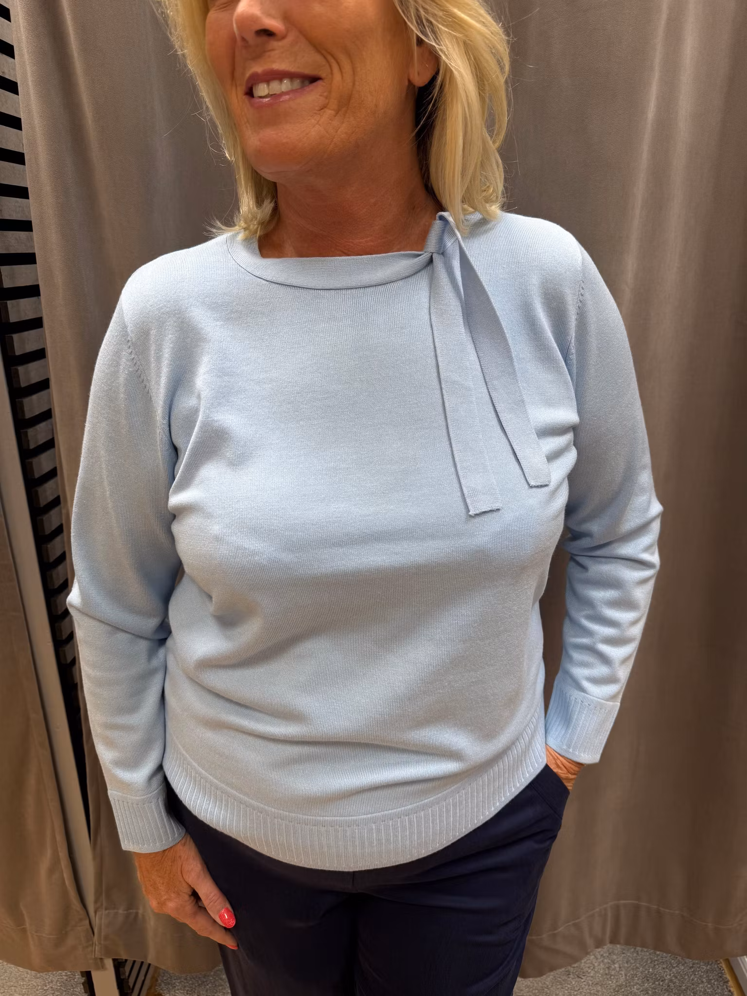 Mjuk och elegant stickad tröja i en fräsch ljusblå nyans. Tröjan har en klassisk, rak passform med rund hals och en stilfull dekorativ flik/knyt-detalj vid halsringningen som ger det lilla extra. Ribbstickad mudd nedtill och vid ärmslut för en fin och bekväm passform.