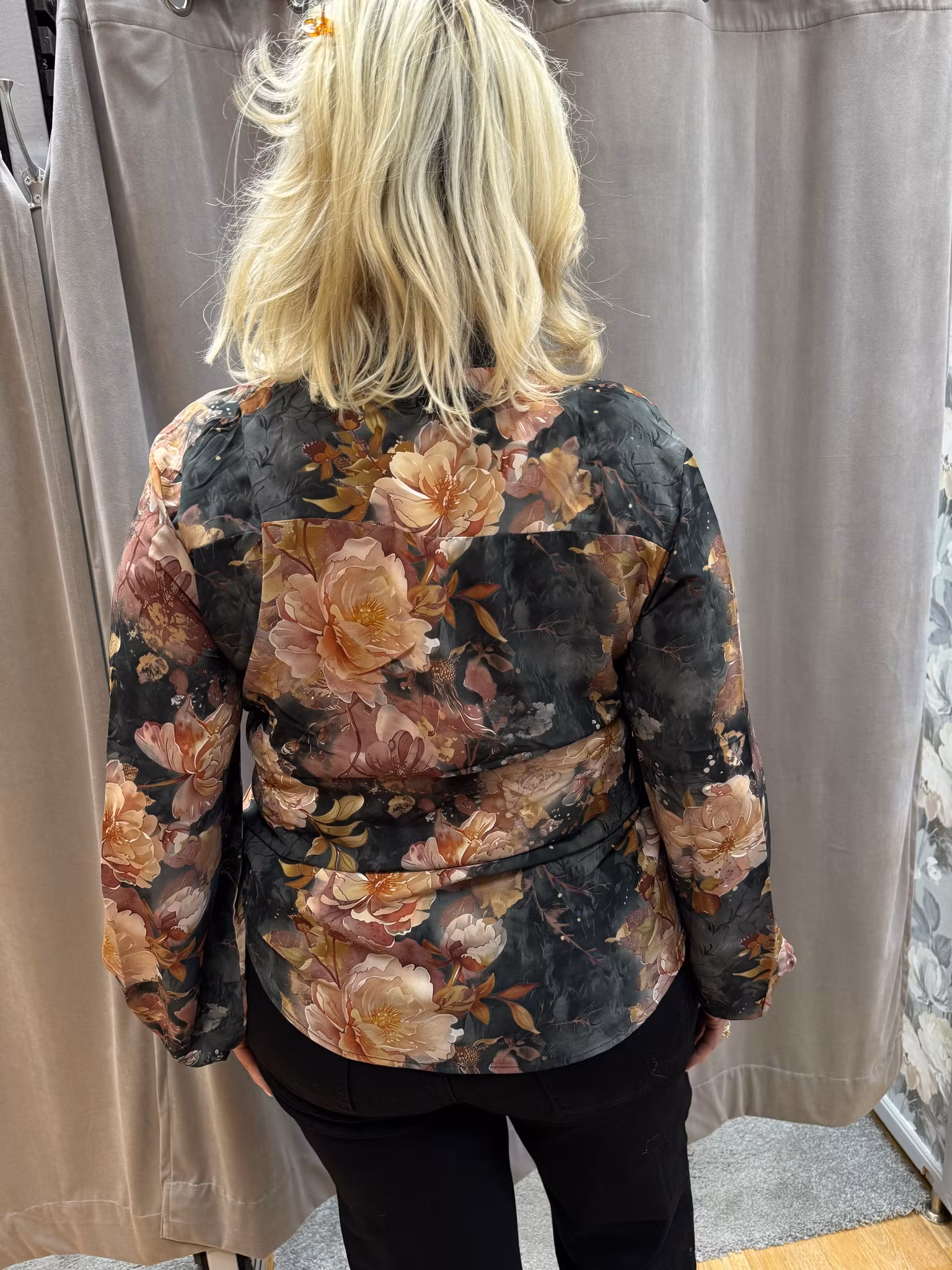 Elegant blus med vackert blommönster i jordnära färger. Klassisk skjortmodell med krage och knappar – lika fin till vardag som till fest.