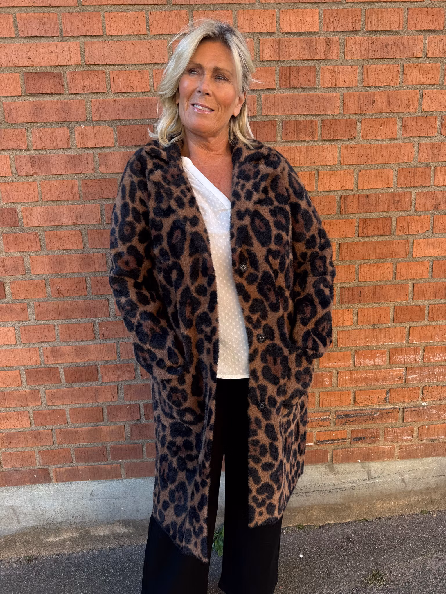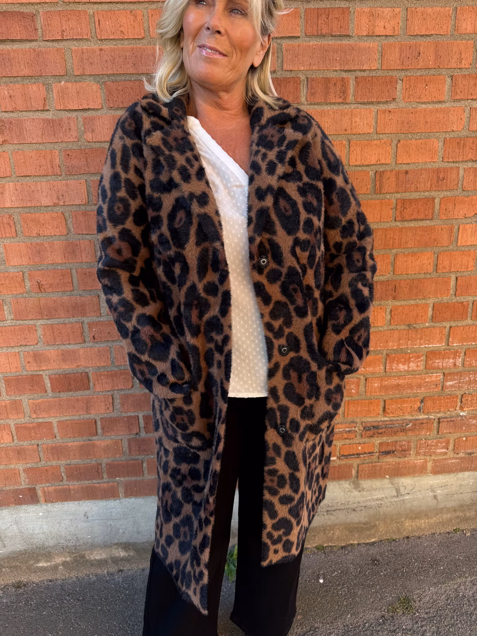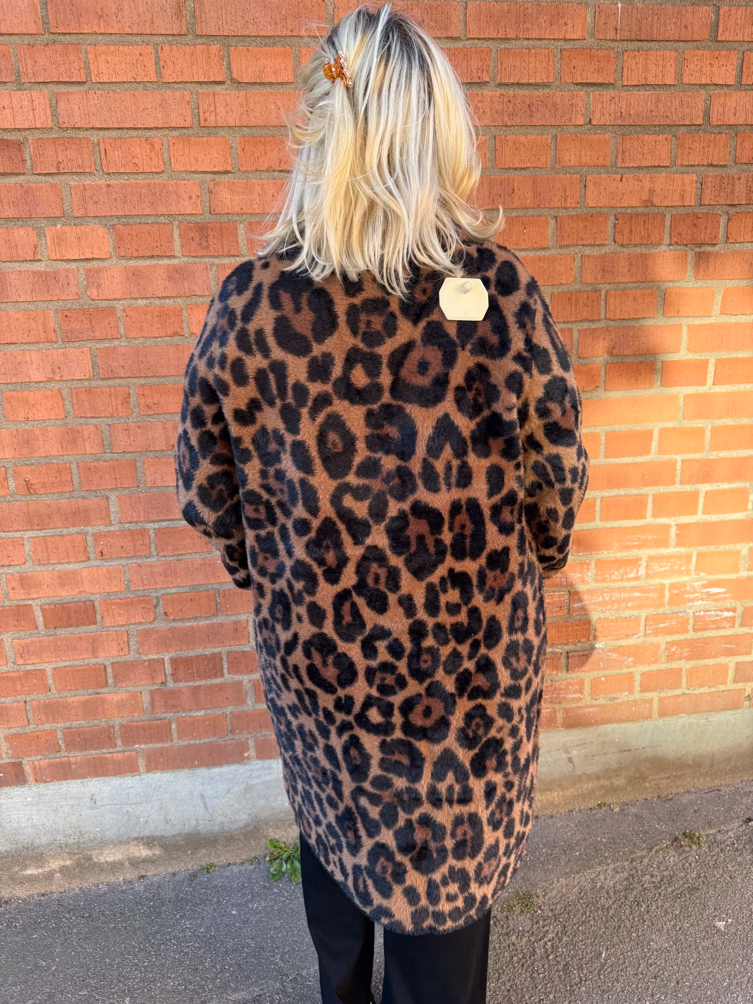Trendig lång kofta i mjuk och mysig kvalitet med djärvt leopardmönster i bruna och svarta toner. Modellen är rak och rymlig med knäppning framtill samt två praktiska fickor. En riktig statement-kofta som lyfter varje outfit och håller dig varm både inne och ute.